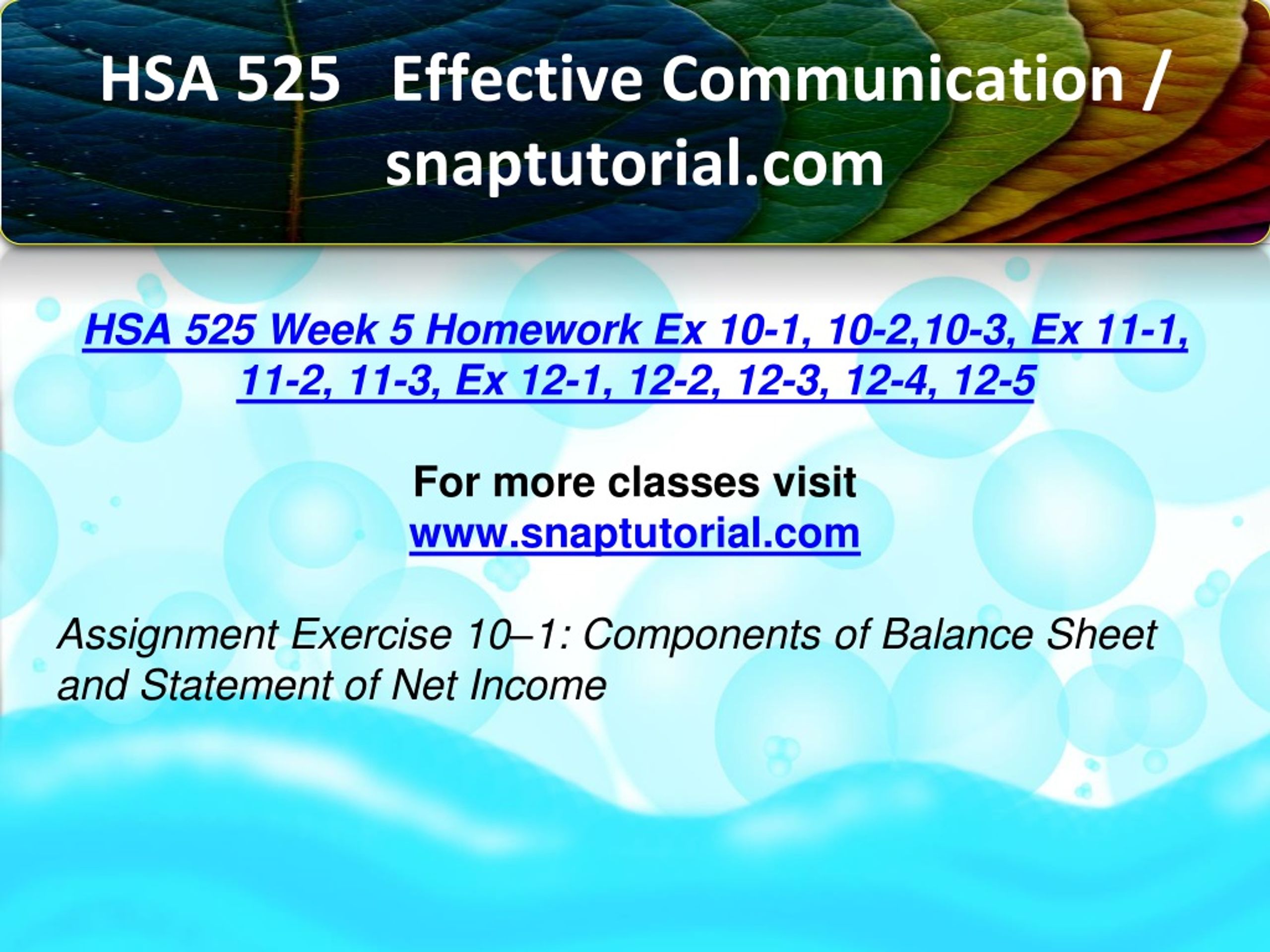 HSA 525 Effective Communication / snaptutorial.com HSA 525 Week 5 Homework Ex 10-1, 10-2,10-3, Ex 11-1, 11-2, 11-3, Ex 12-1, 12-2, 12-3, 12-4, 12-5 For more classes visit www.snaptutorial.com Assignment Exercise 10–1: Components of Balance Sheet and Statement of Net Income