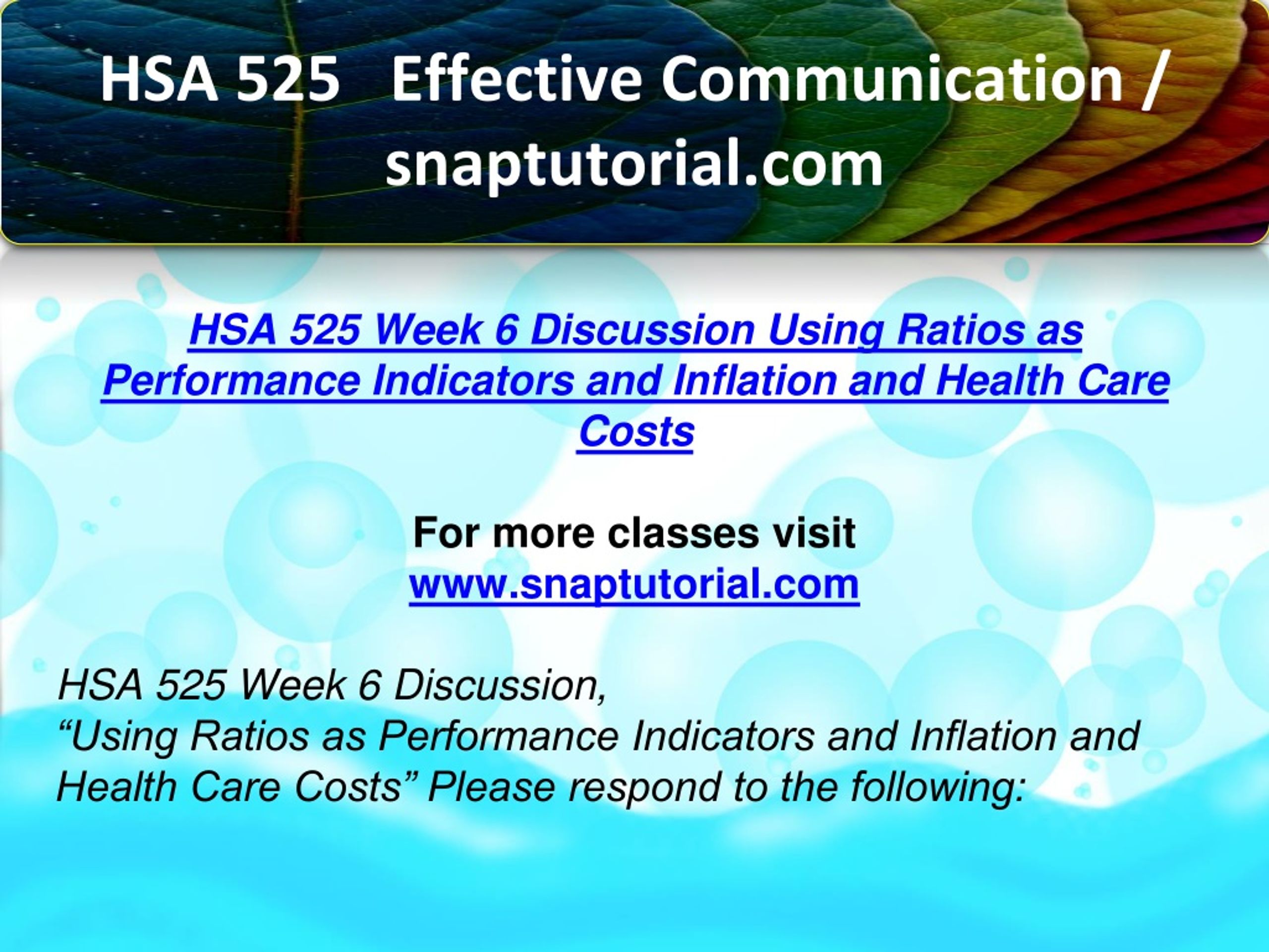 HSA 525 Effective Communication / snaptutorial.com HSA 525 Week 6 Discussion Using Ratios as Performance Indicators and Inflation and Health Care Costs For more classes visit www.snaptutorial.com HSA 525 Week 6 Discussion, “Using Ratios as Performance Indicators and Inflation and Health Care Costs” Please respond to the following: