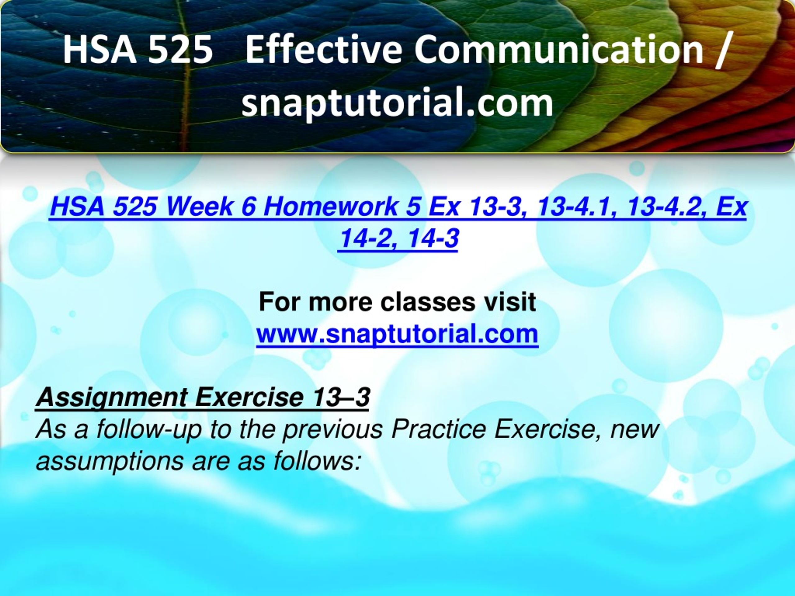 HSA 525 Effective Communication / snaptutorial.com HSA 525 Week 6 Homework 5 Ex 13-3, 13-4.1, 13-4.2, Ex 14-2, 14-3 For more classes visit www.snaptutorial.com Assignment Exercise 13–3 As a follow-up to the previous Practice Exercise, new assumptions are as follows: