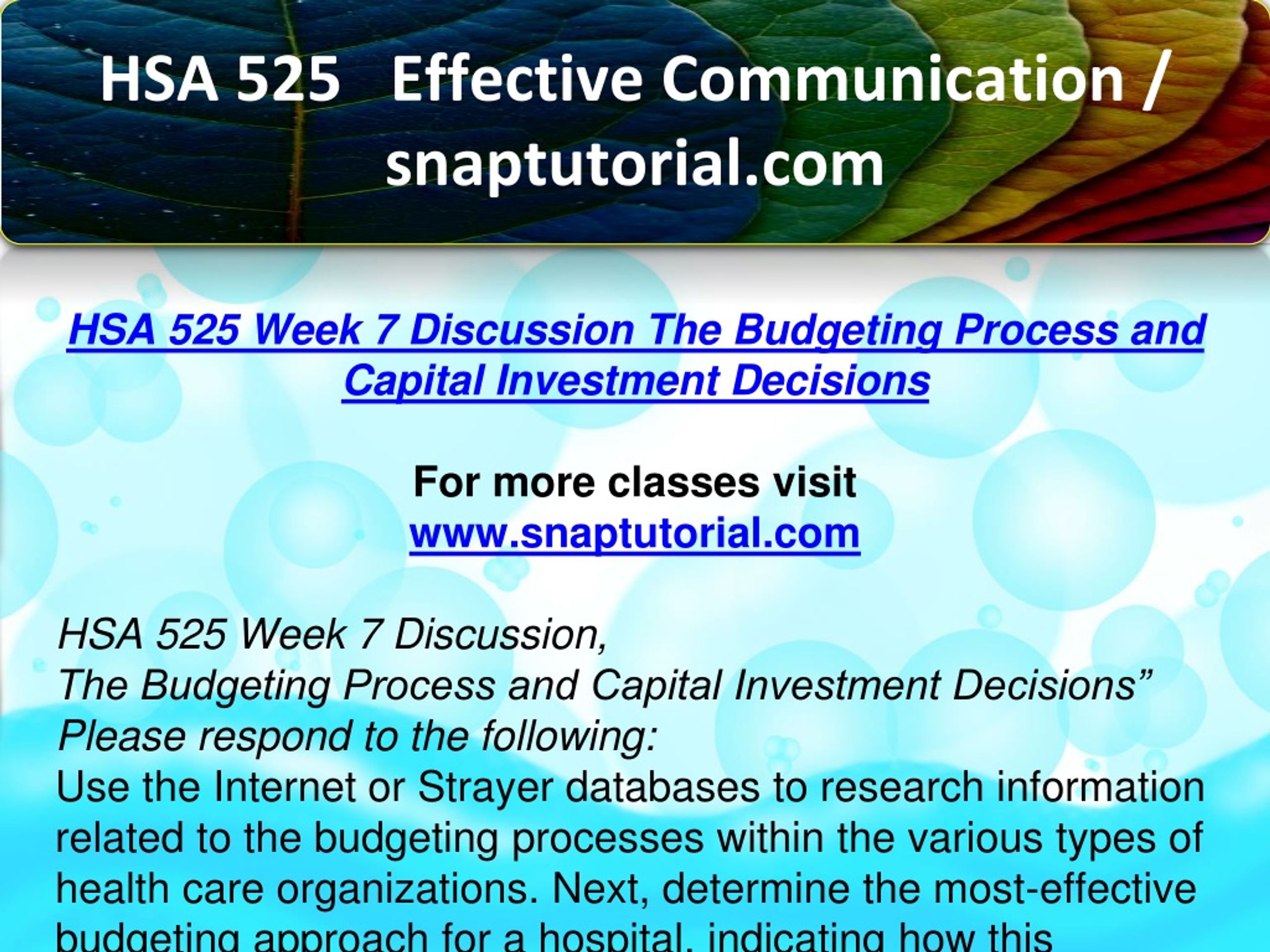 HSA 525 Effective Communication / snaptutorial.com HSA 525 Week 7 Discussion The Budgeting Process and Capital Investment Decisions For more classes visit www.snaptutorial.com HSA 525 Week 7 Discussion, The Budgeting Process and Capital Investment Decisions” Please respond to the following: Use the Internet or Strayer databases to research information related to the budgeting processes within the various types of health care organizations. Next, determine the most-effective budgeting approach for a hospital, indicating how this