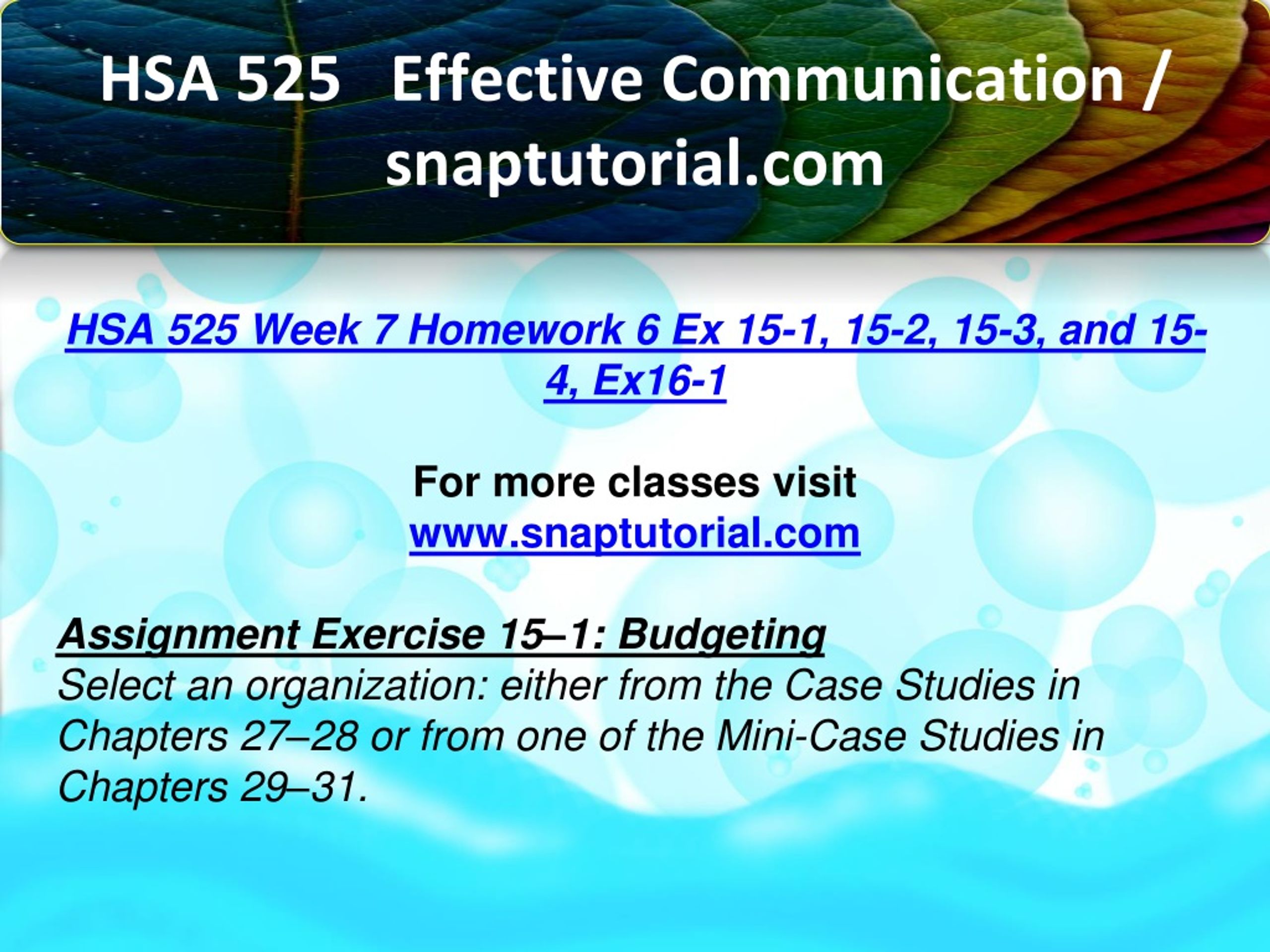 HSA 525 Effective Communication / snaptutorial.com HSA 525 Week 7 Homework 6 Ex 15-1, 15-2, 15-3, and 15-4, Ex16-1 For more classes visit www.snaptutorial.com Assignment Exercise 15–1: Budgeting Select an organization: either from the Case Studies in Chapters 27–28 or from one of the Mini-Case Studies in Chapters 29–31.