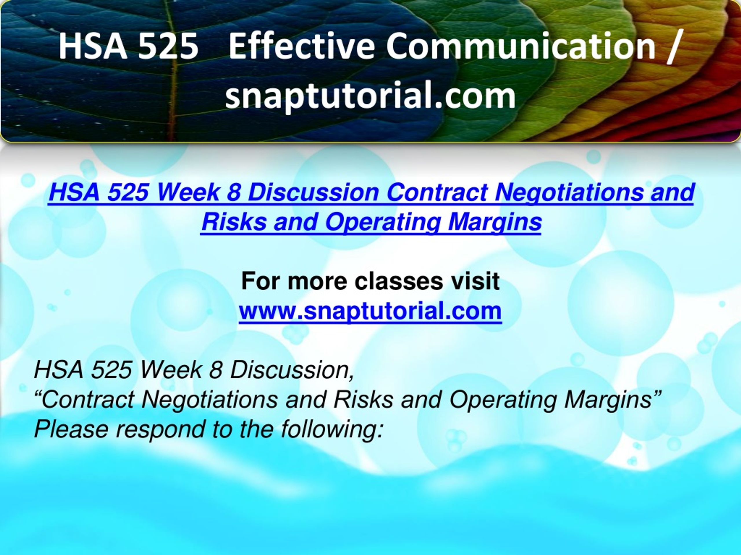 HSA 525 Effective Communication / snaptutorial.com HSA 525 Week 8 Discussion Contract Negotiations and Risks and Operating Margins For more classes visit www.snaptutorial.com HSA 525 Week 8 Discussion, “Contract Negotiations and Risks and Operating Margins” Please respond to the following: