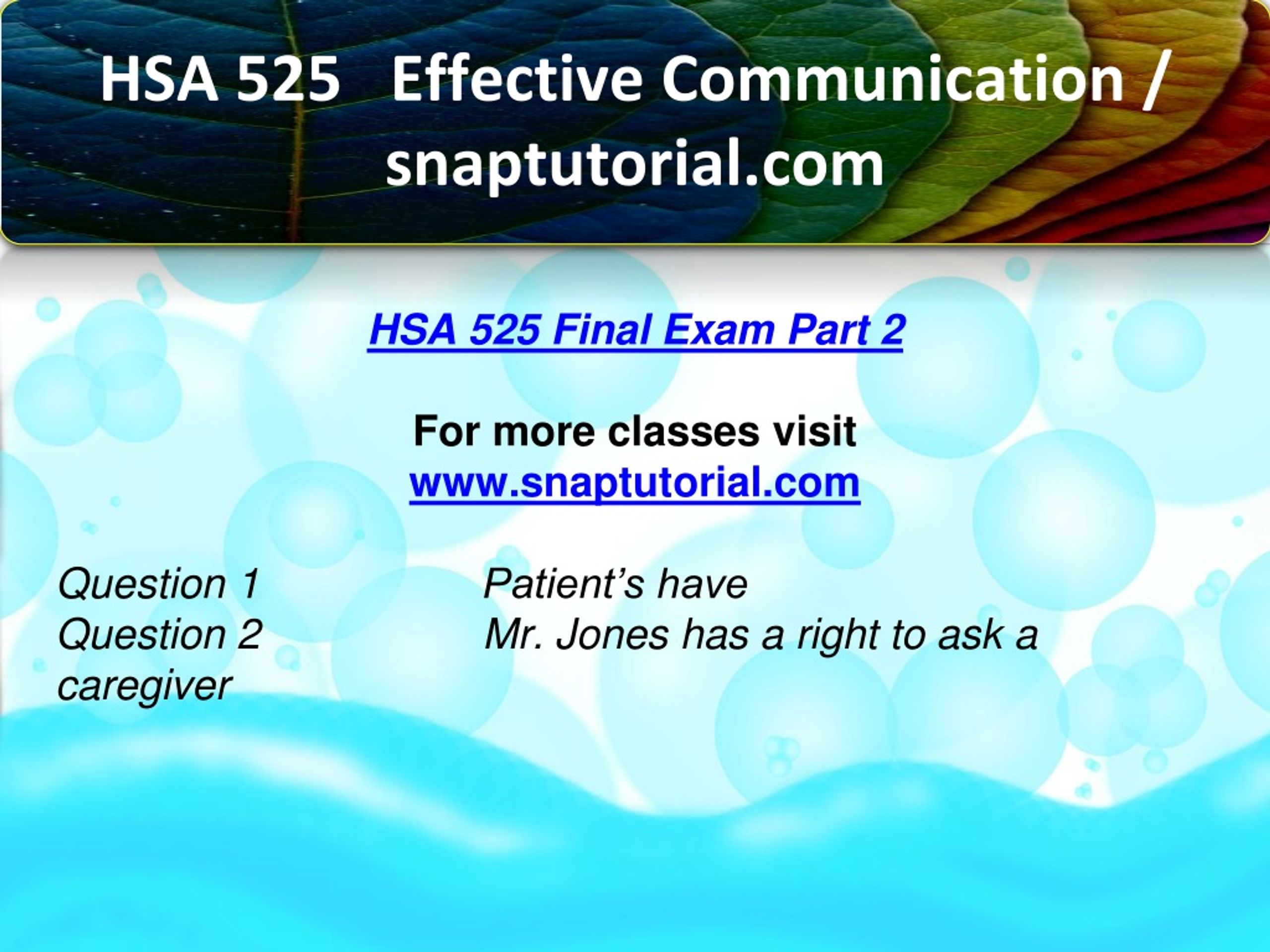 HSA 525 Effective Communication / snaptutorial.com HSA 525 Final Exam Part 2 For more classes visit www.snaptutorial.com Question 1 Patient’s have Question 2 Mr. Jones has a right to ask a caregiver
