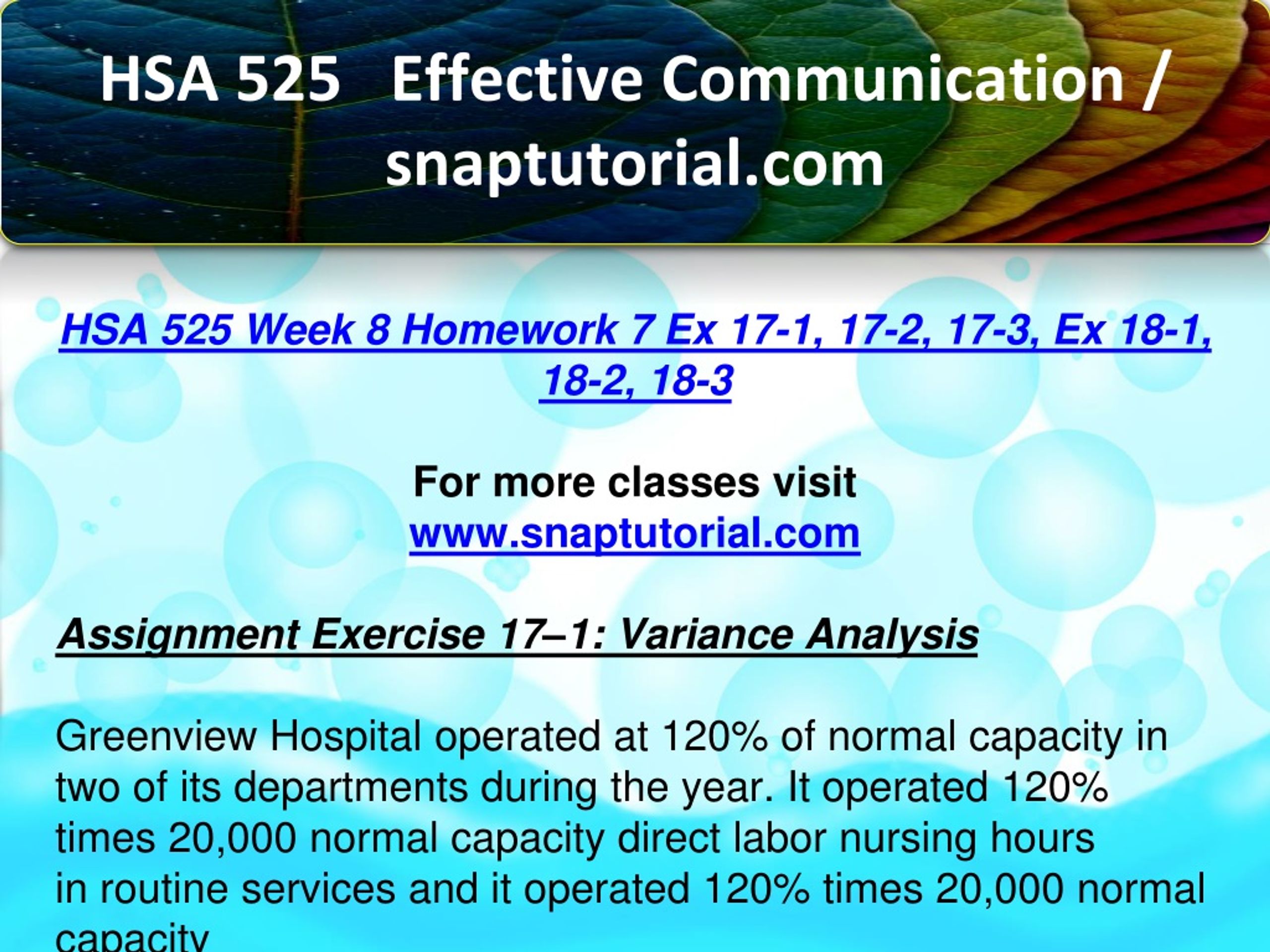 HSA 525 Effective Communication / snaptutorial.com HSA 525 Week 8 Homework 7 Ex 17-1, 17-2, 17-3, Ex 18-1, 18-2, 18-3 For more classes visit www.snaptutorial.com Assignment Exercise 17–1: Variance Analysis Greenview Hospital operated at 120% of normal capacity in two of its departments during the year. It operated 120% times 20,000 normal capacity direct labor nursing hours in routine services and it operated 120% times 20,000 normal capacity