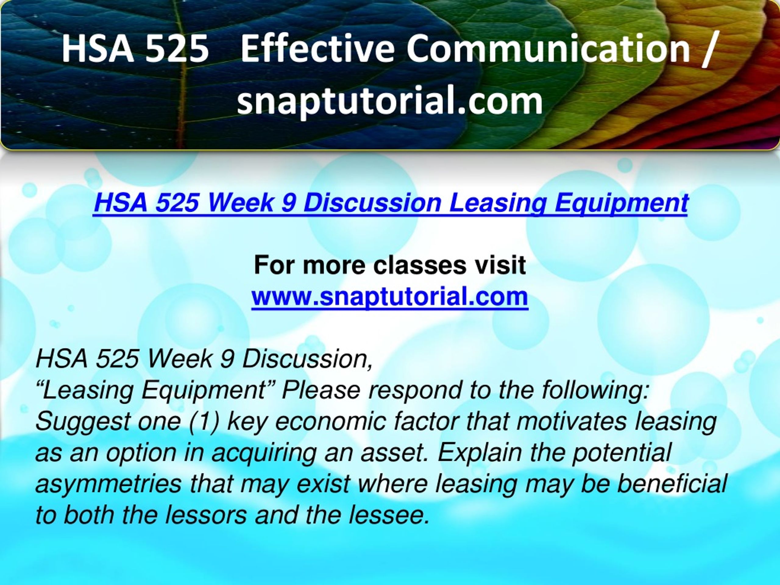 HSA 525 Effective Communication / snaptutorial.com • HSA 525 Week 9 Discussion Leasing Equipment • For more classes visit • www.snaptutorial.com • HSA 525 Week 9 Discussion, • “Leasing Equipment” Please respond to the following: • Suggest one (1) key economic factor that motivates leasing as an option in acquiring an asset. Explain the potential asymmetries that may exist where leasing may be beneficial to both the lessors and the lessee.