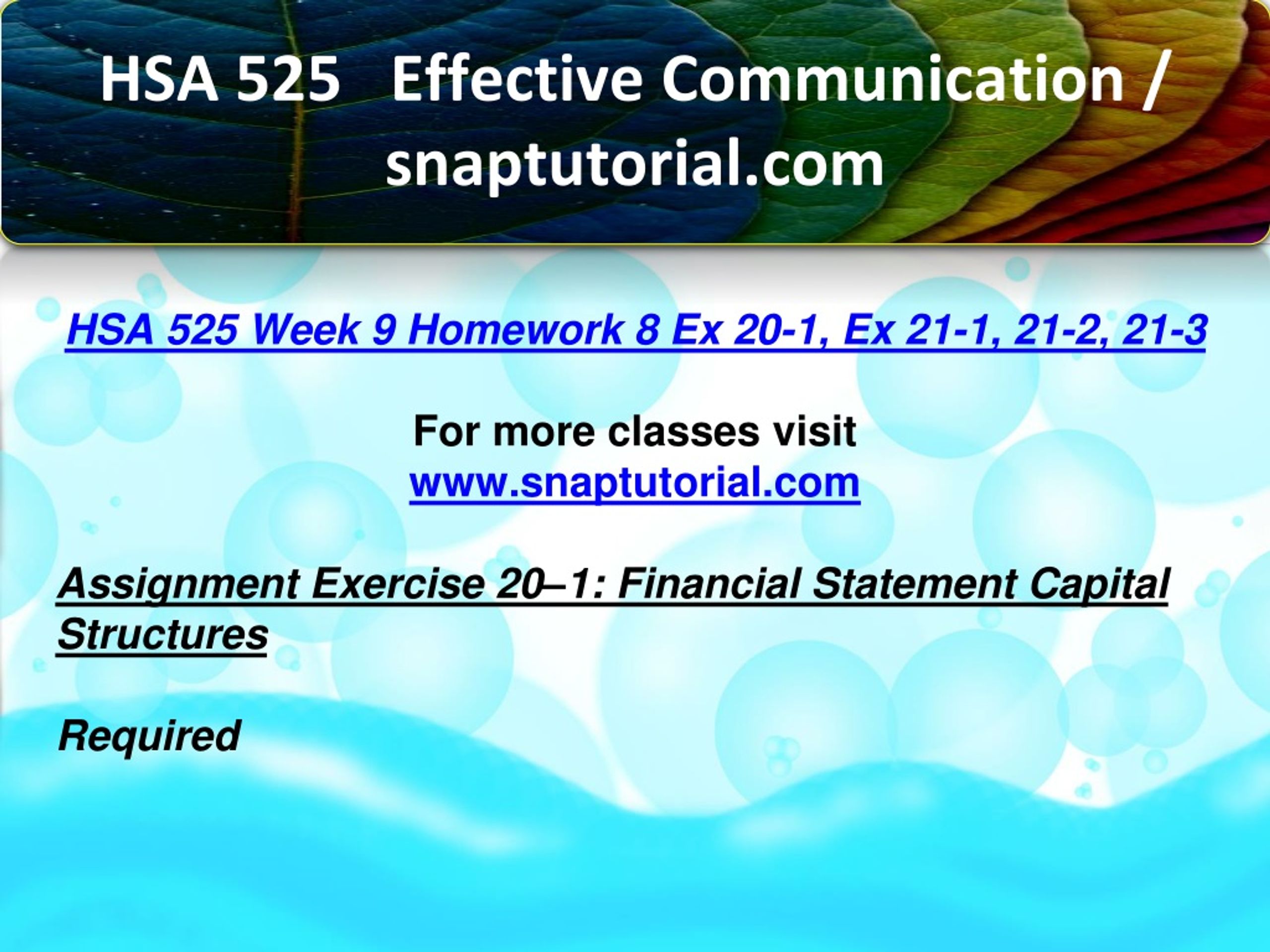HSA 525 Effective Communication / snaptutorial.com HSA 525 Week 9 Homework 8 Ex 20-1, Ex 21-1, 21-2, 21-3 For more classes visit www.snaptutorial.com Assignment Exercise 20–1: Financial Statement Capital Structures Required
