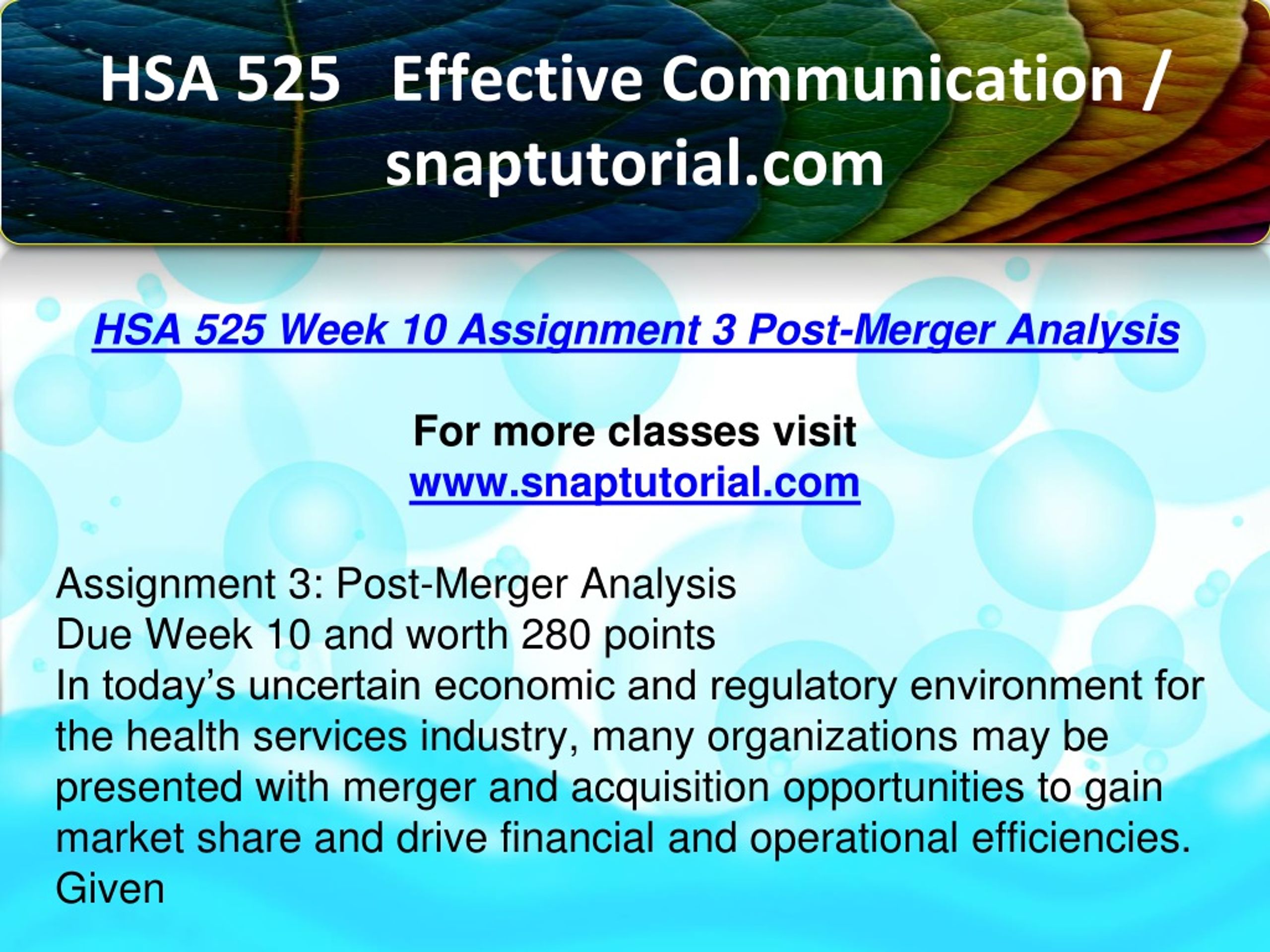 HSA 525 Effective Communication / snaptutorial.com HSA 525 Week 10 Assignment 3 Post-Merger Analysis For more classes visit www.snaptutorial.com Assignment 3: Post-Merger AnalysisDue Week 10 and worth 280 pointsIn today’s uncertain economic and regulatory environment for the health services industry, many organizations may be presented with merger and acquisition opportunities to gain market share and drive financial and operational efficiencies. Given
