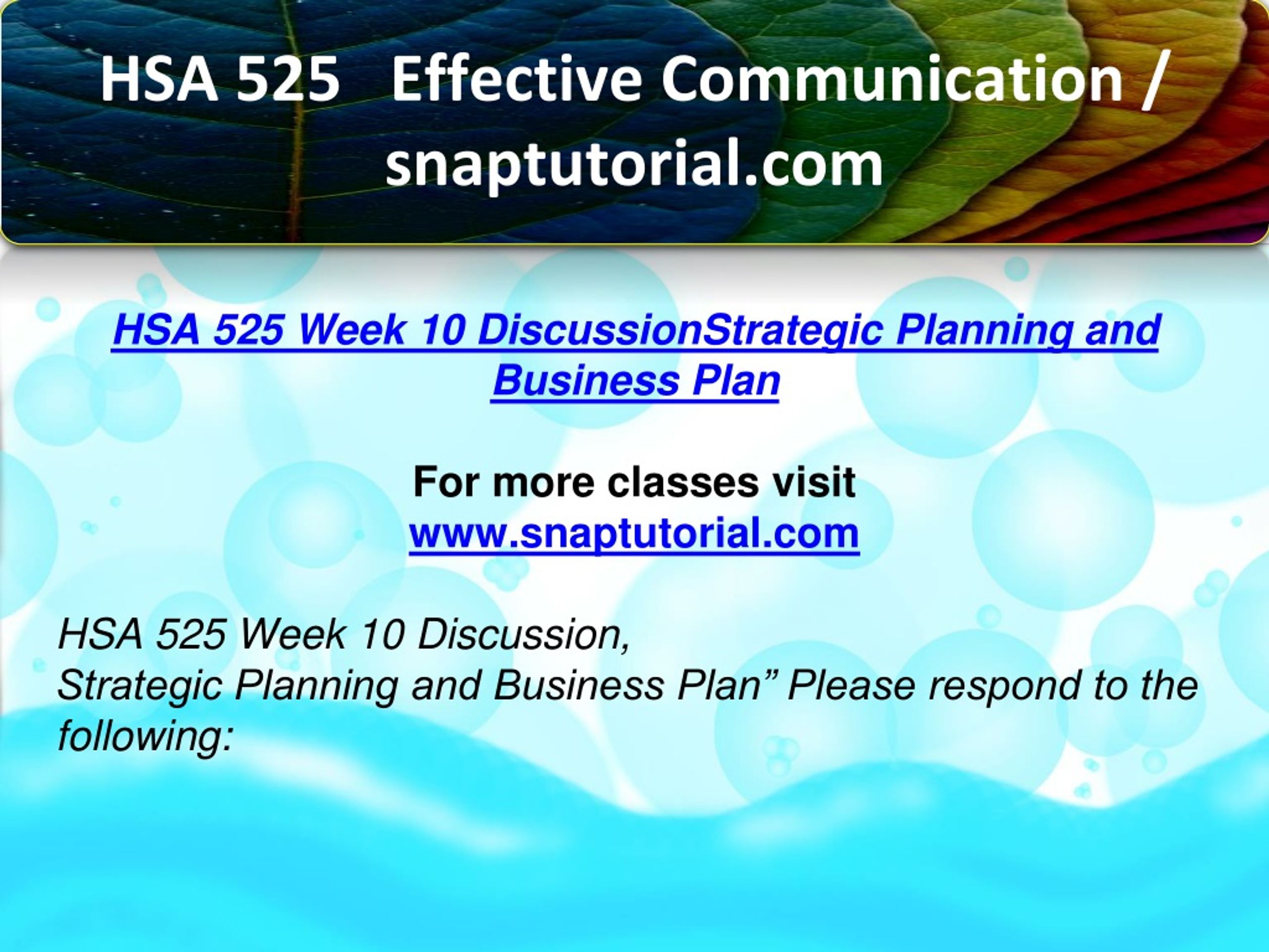 HSA 525 Effective Communication / snaptutorial.com HSA 525 Week 10 DiscussionStrategic Planning and Business Plan For more classes visit www.snaptutorial.com HSA 525 Week 10 Discussion, Strategic Planning and Business Plan” Please respond to the following: