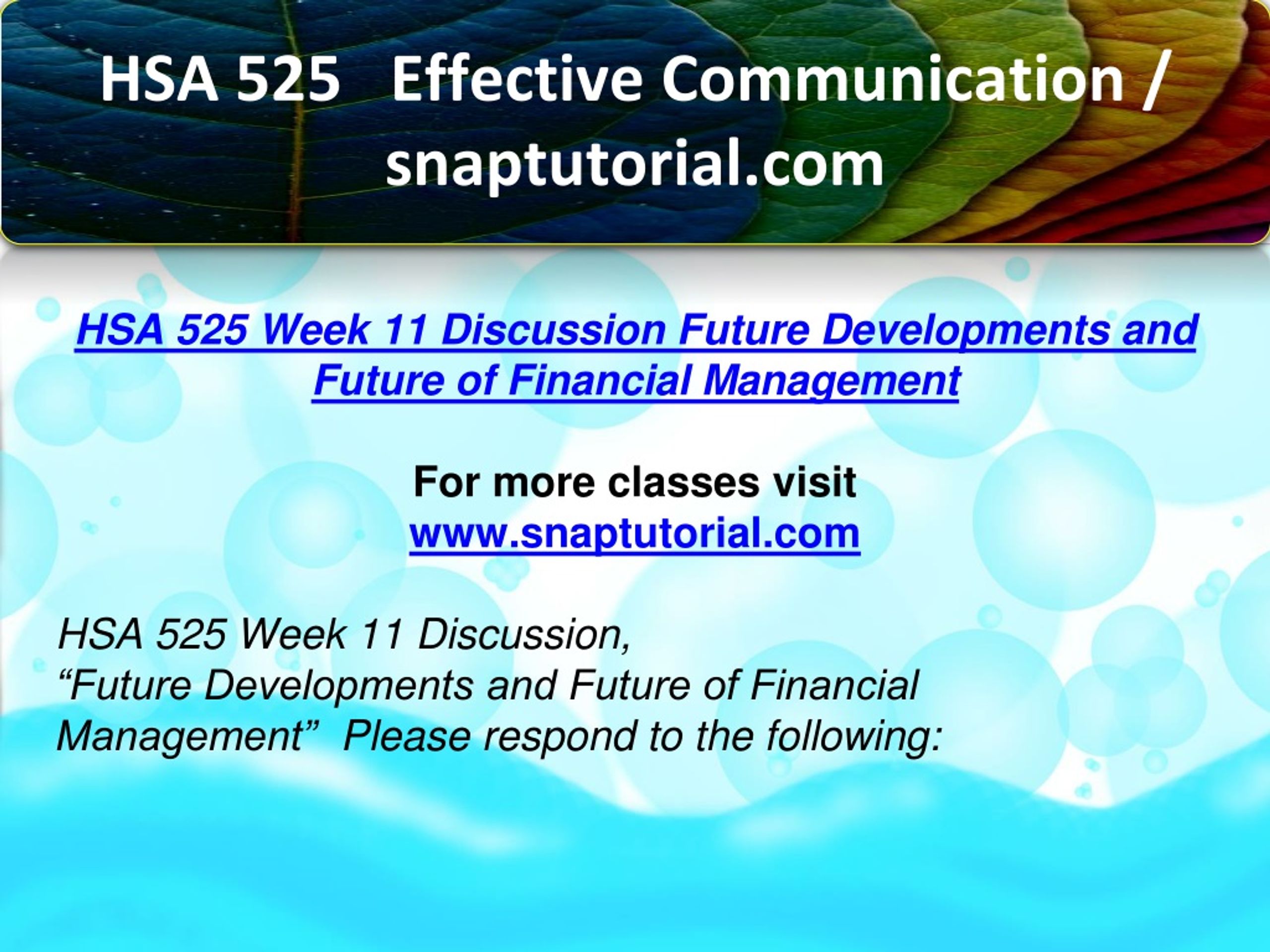 HSA 525 Effective Communication / snaptutorial.com HSA 525 Week 11 Discussion Future Developments and Future of Financial Management For more classes visit www.snaptutorial.com HSA 525 Week 11 Discussion, “Future Developments and Future of Financial Management” Please respond to the following: