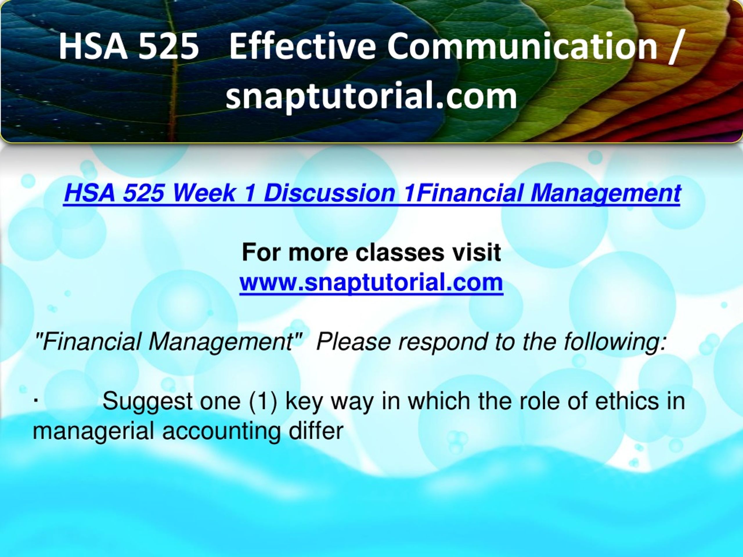 HSA 525 Effective Communication / snaptutorial.com HSA 525 Week 1 Discussion 1Financial Management For more classes visit www.snaptutorial.com "Financial Management" Please respond to the following: · Suggest one (1) key way in which the role of ethics in managerial accounting differ