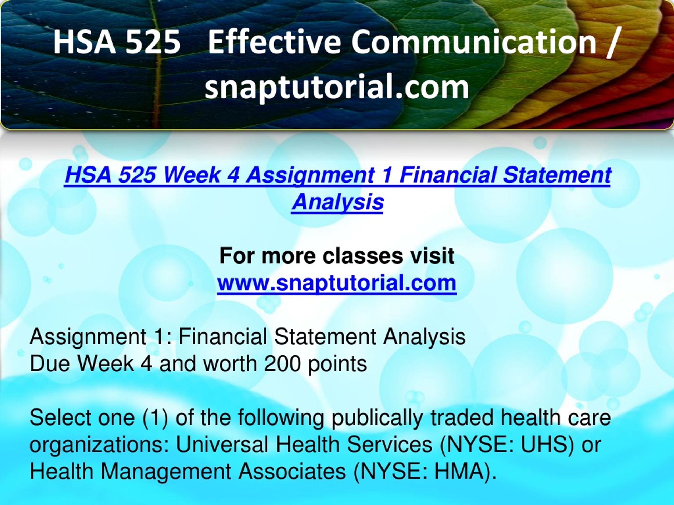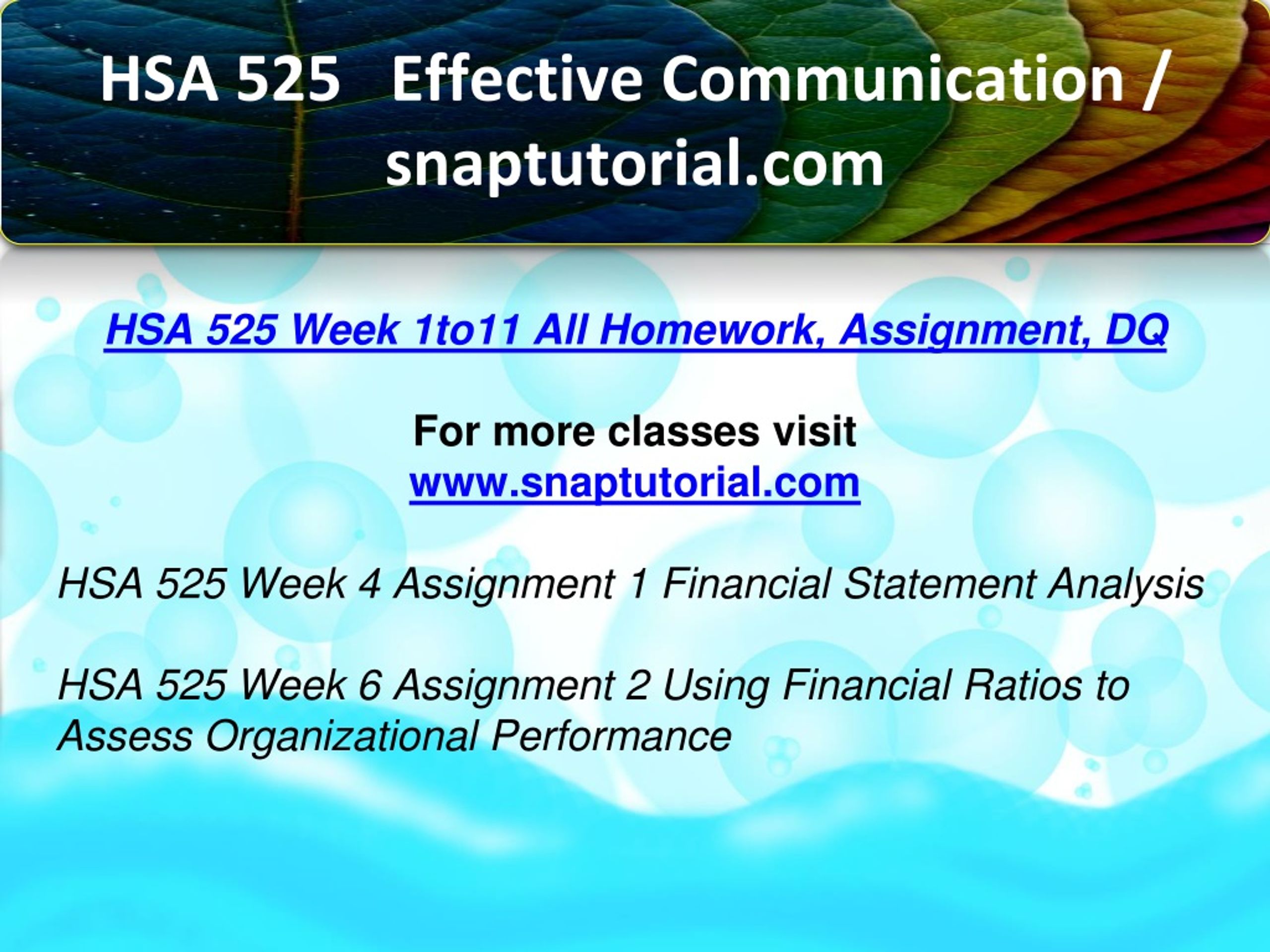 HSA 525 Effective Communication / snaptutorial.com HSA 525 Week 1to11 All Homework, Assignment, DQ For more classes visit www.snaptutorial.com HSA 525 Week 4 Assignment 1 Financial Statement Analysis HSA 525 Week 6 Assignment 2 Using Financial Ratios to Assess Organizational Performance