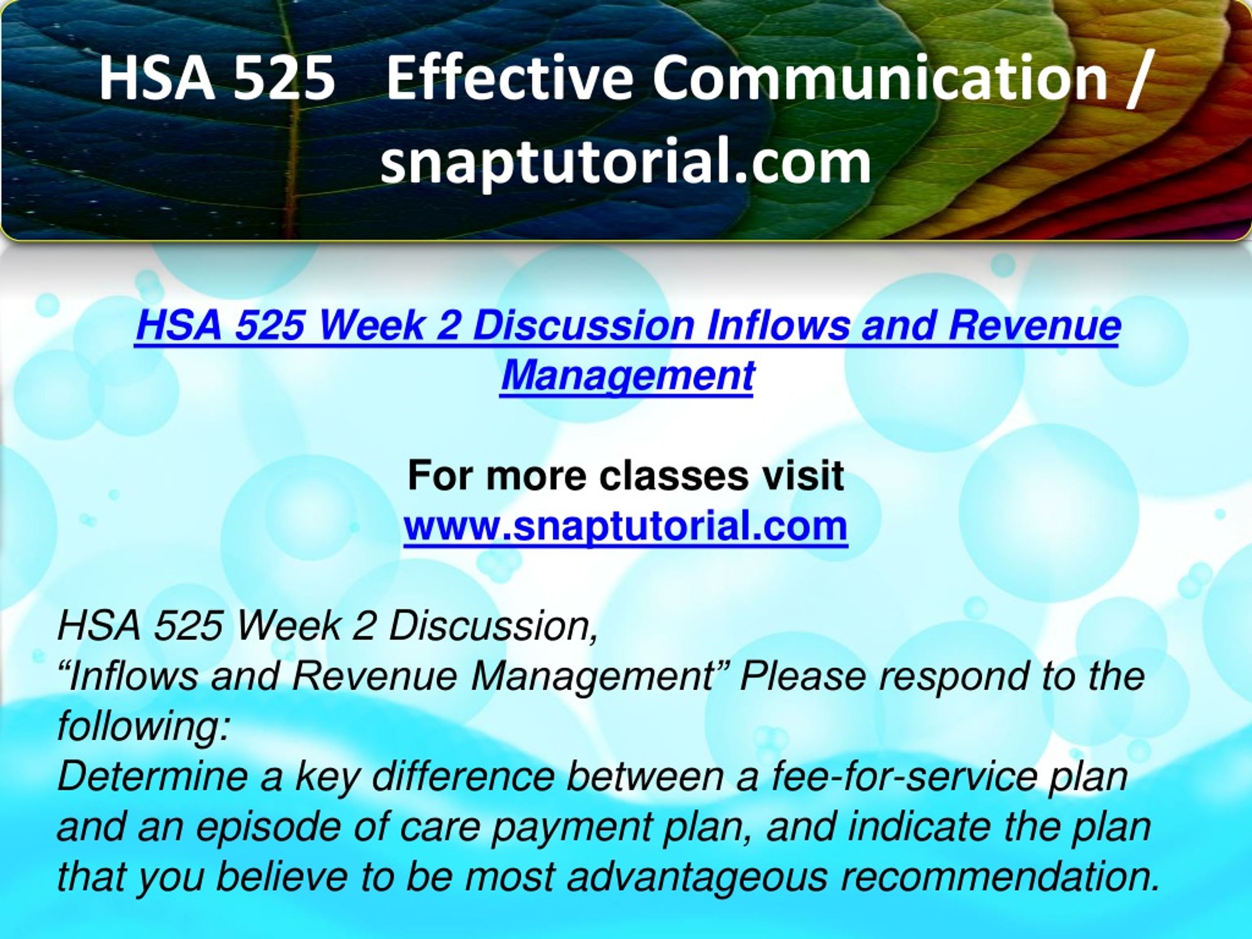 HSA 525 Effective Communication / snaptutorial.com • HSA 525 Week 2 Discussion Inflows and Revenue Management • For more classes visit • www.snaptutorial.com • HSA 525 Week 2 Discussion, • “Inflows and Revenue Management” Please respond to the following: • Determine a key difference between a fee-for-service plan and an episode of care payment plan, and indicate the plan that you believe to be most advantageous recommendation.