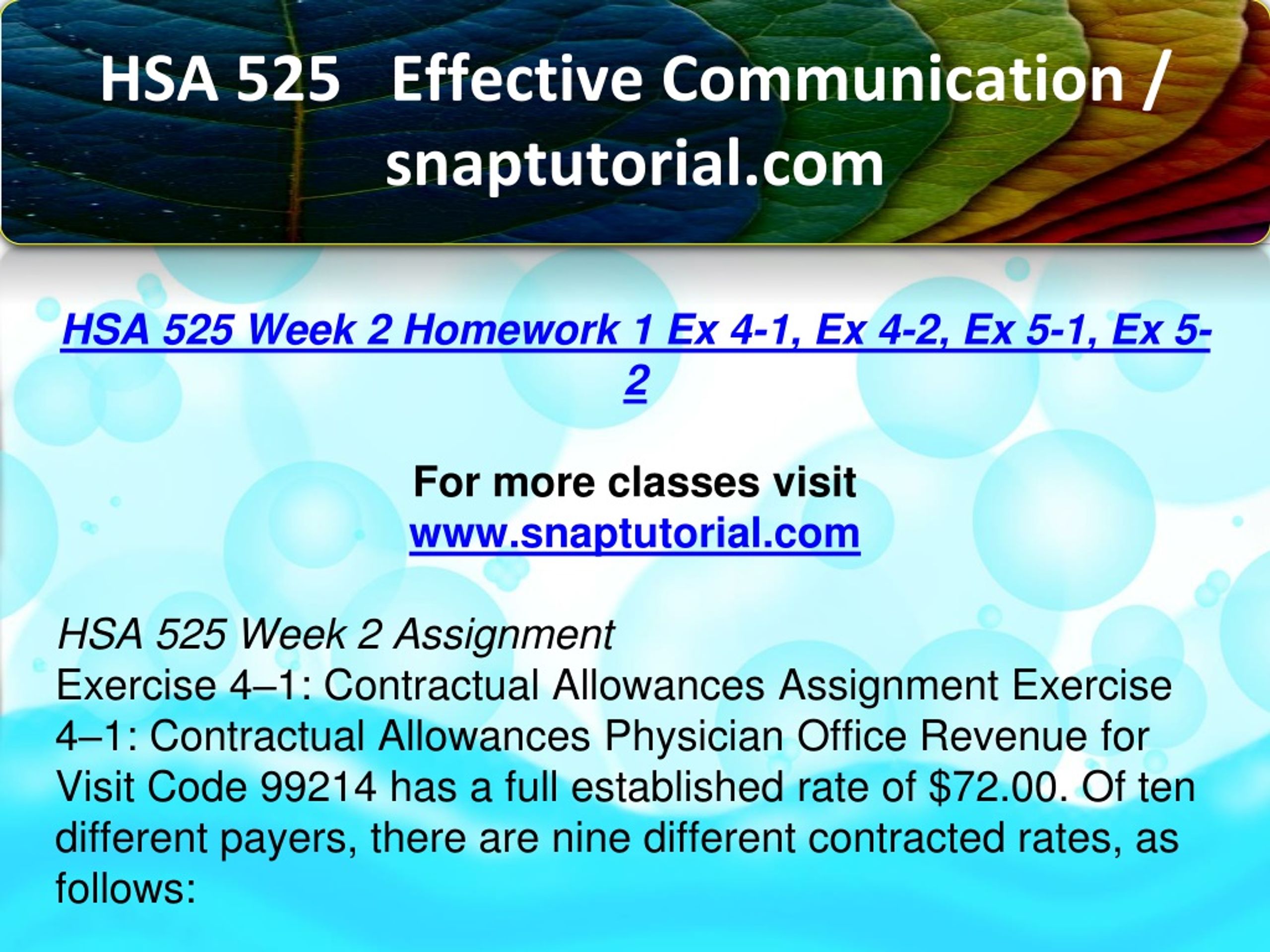 HSA 525 Effective Communication / snaptutorial.com HSA 525 Week 2 Homework 1 Ex 4-1, Ex 4-2, Ex 5-1, Ex 5-2 For more classes visit www.snaptutorial.com HSA 525 Week 2 Assignment Exercise 4–1: Contractual Allowances Assignment Exercise 4–1: Contractual Allowances Physician Office Revenue for Visit Code 99214 has a full established rate of $72.00. Of ten different payers, there are nine different contracted rates, as follows:
