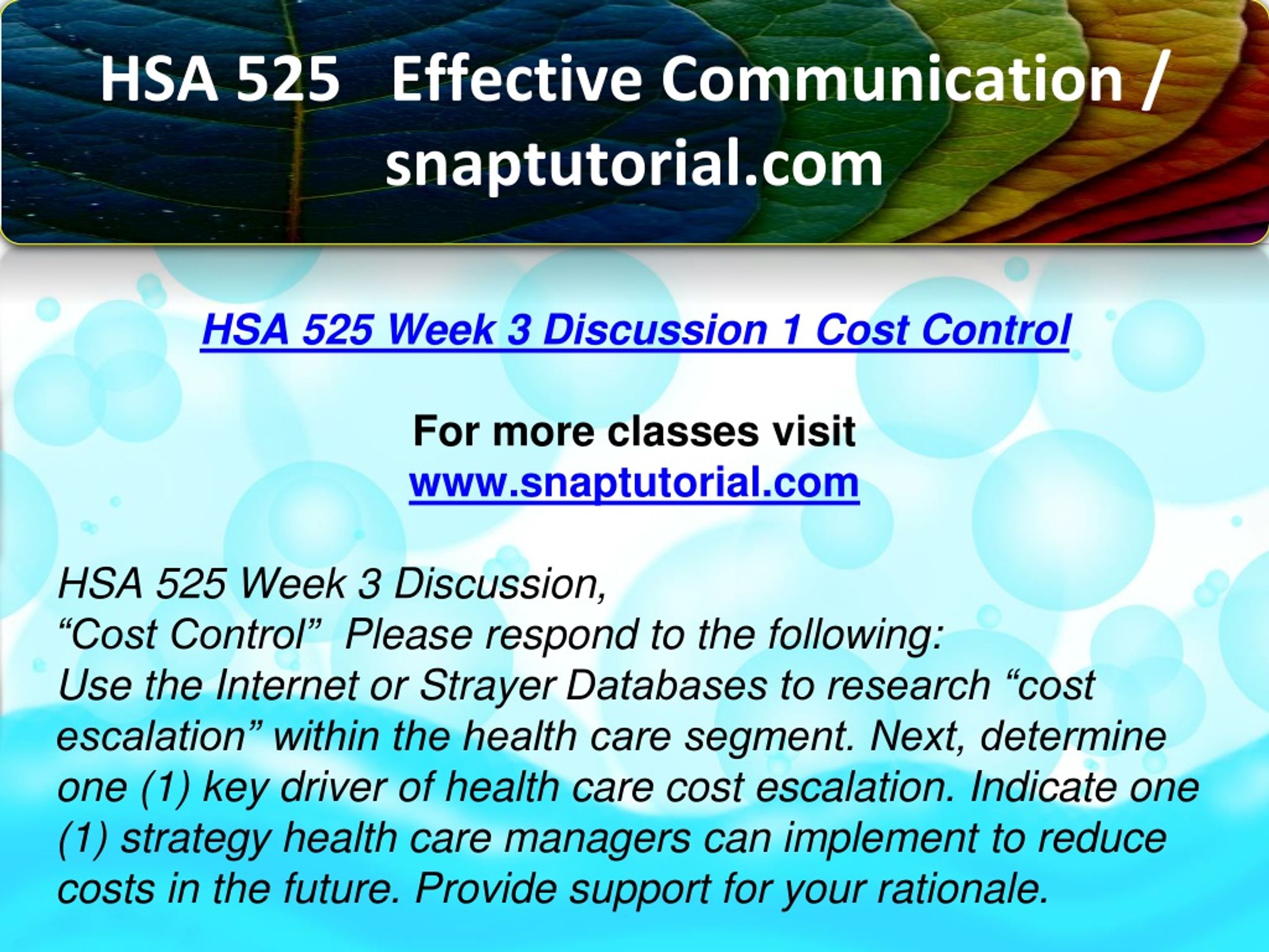 HSA 525 Effective Communication / snaptutorial.com • HSA 525 Week 3 Discussion 1 Cost Control • For more classes visit • www.snaptutorial.com • HSA 525 Week 3 Discussion, • “Cost Control” Please respond to the following: • Use the Internet or Strayer Databases to research “cost escalation” within the health care segment. Next, determine one (1) key driver of health care cost escalation. Indicate one (1) strategy health care managers can implement to reduce costs in the future. Provide support for your rationale.