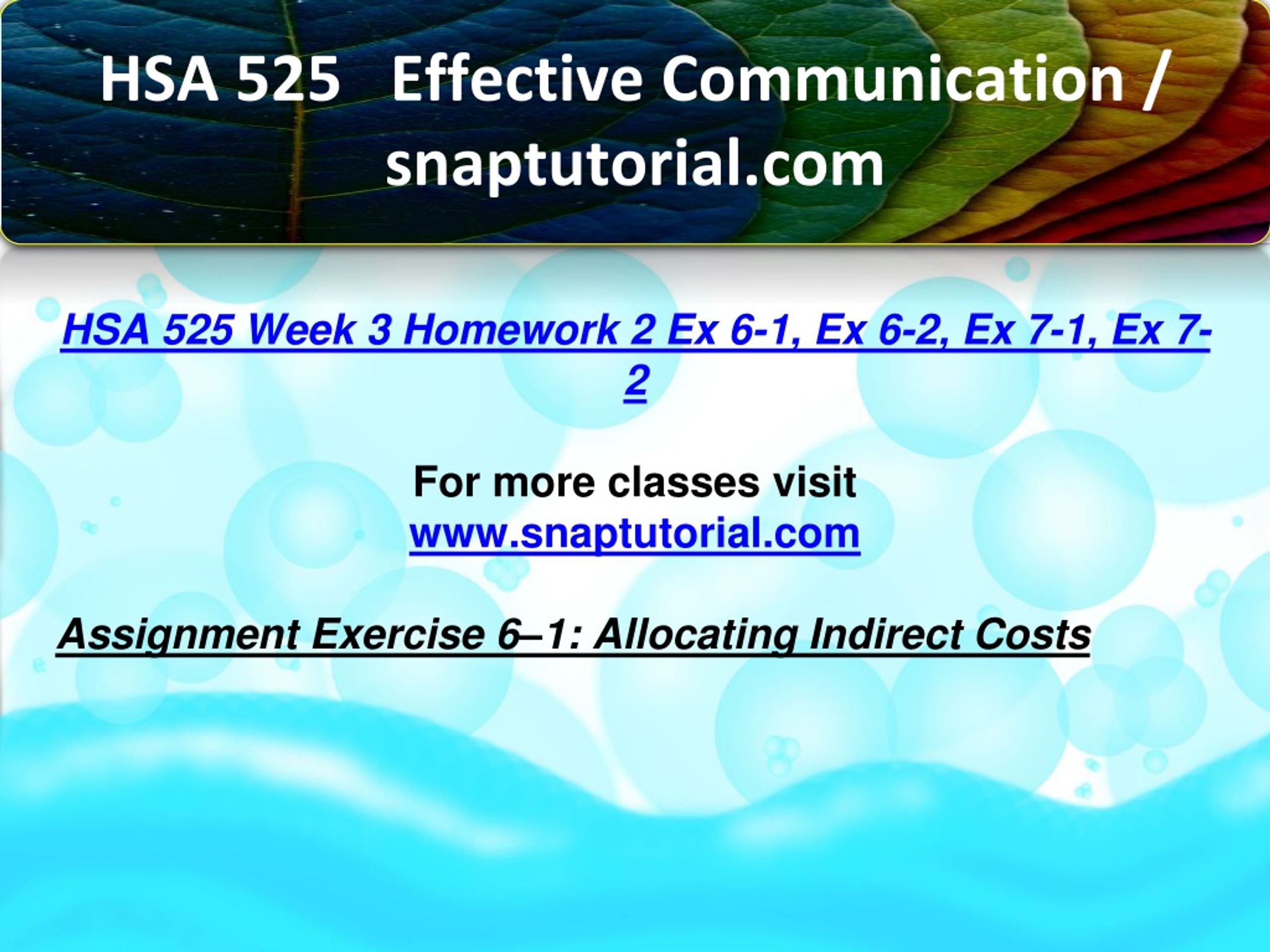 HSA 525 Effective Communication / snaptutorial.com HSA 525 Week 3 Homework 2 Ex 6-1, Ex 6-2, Ex 7-1, Ex 7-2 For more classes visit www.snaptutorial.com Assignment Exercise 6–1: Allocating Indirect Costs