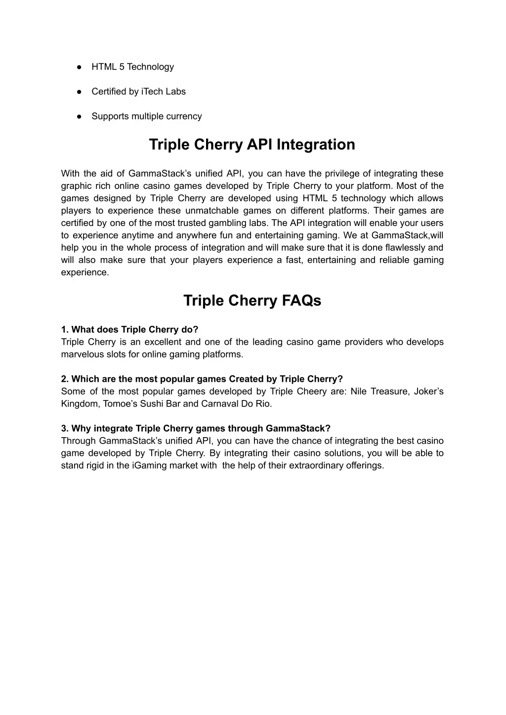 ● HTML 5 Technology ● Certified by iTech Labs ● Supports multiple currency Triple Cherry API Integration With the aid of GammaStack’s unified API, you can have the privilege of integrating these graphic rich online casino games developed by Triple Cherry to your platform. Most of the games designed by Triple Cherry are developed using HTML 5 technology which allows players to experience these unmatchable games on different platforms. Their games are certified by one of the most trusted gambling labs. The API integration will enable your users to experience anytime and anywhere fun and entertaining gaming. We at GammaStack,will help you in the whole process of integration and will make sure that it is done flawlessly and will also make sure that your players experience a fast, entertaining and reliable gaming experience. Triple Cherry FAQs 1. What does Triple Cherry do? Triple Cherry is an excellent and one of the leading casino game providers who develops marvelous slots for online gaming platforms. 2. Which are the most popular games Created by Triple Cherry? Some of the most popular games developed by Triple Cheery are: Nile Treasure, Joker’s Kingdom, Tomoe’s Sushi Bar and Carnaval Do Rio. 3. Why integrate Triple Cherry games through GammaStack? Through GammaStack’s unified API, you can have the chance of integrating the best casino game developed by Triple Cherry. By integrating their casino solutions, you will be able to stand rigid in the iGaming market with the help of their extraordinary offerings.