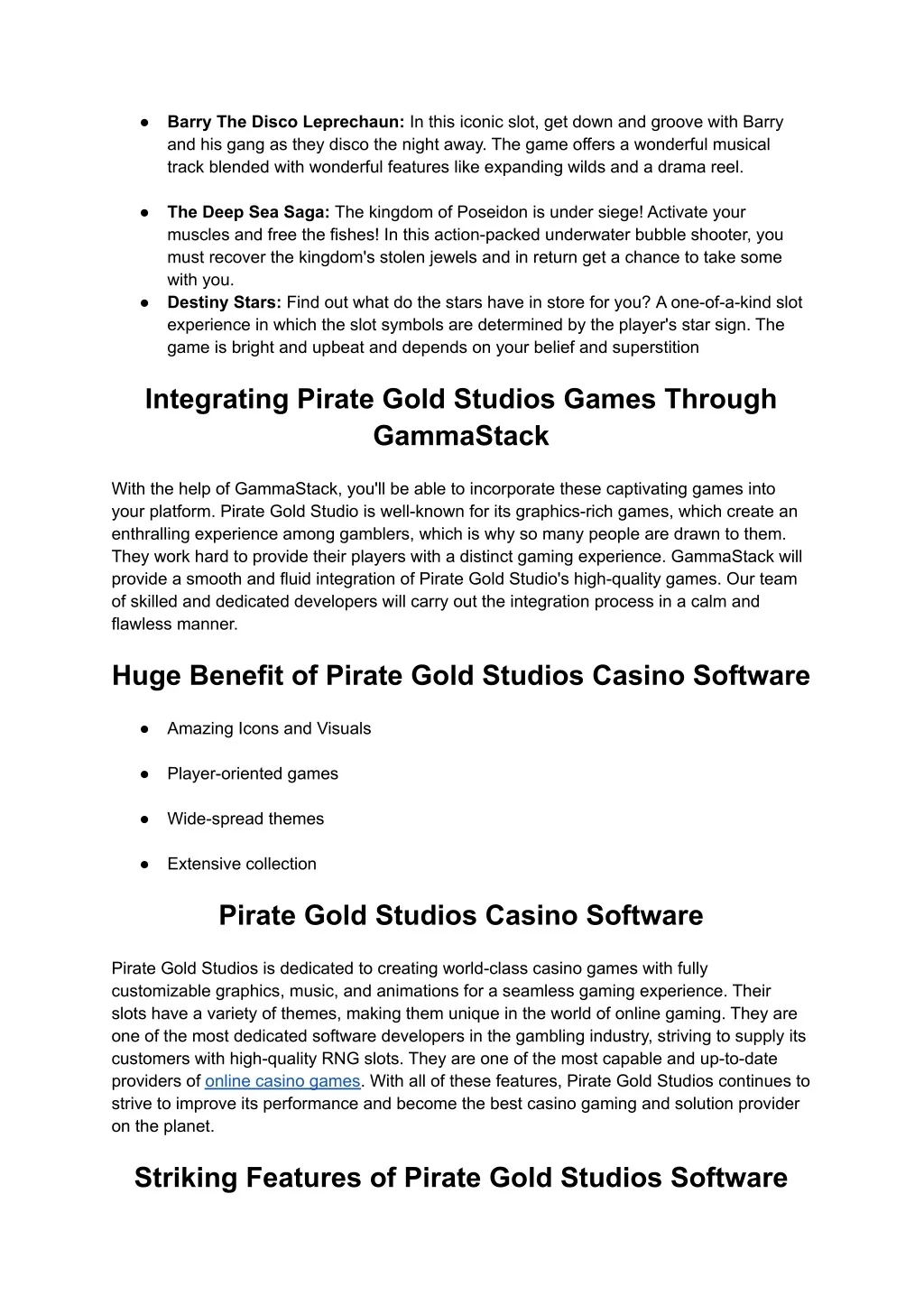 ● Barry The Disco Leprechaun: In this iconic slot, get down and groove with Barry and his gang as they disco the night away. The game offers a wonderful musical track blended with wonderful features like expanding wilds and a drama reel. ● The Deep Sea Saga: The kingdom of Poseidon is under siege! Activate your muscles and free the fishes! In this action-packed underwater bubble shooter, you must recover the kingdom's stolen jewels and in return get a chance to take some with you. Destiny Stars: Find out what do the stars have in store for you? A one-of-a-kind slot experience in which the slot symbols are determined by the player's star sign. The game is bright and upbeat and depends on your belief and superstition ● Integrating Pirate Gold Studios Games Through GammaStack With the help of GammaStack, you'll be able to incorporate these captivating games into your platform. Pirate Gold Studio is well-known for its graphics-rich games, which create an enthralling experience among gamblers, which is why so many people are drawn to them. They work hard to provide their players with a distinct gaming experience. GammaStack will provide a smooth and fluid integration of Pirate Gold Studio's high-quality games. Our team of skilled and dedicated developers will carry out the integration process in a calm and flawless manner. Huge Benefit of Pirate Gold Studios Casino Software ● Amazing Icons and Visuals ● Player-oriented games ● Wide-spread themes ● Extensive collection Pirate Gold Studios Casino Software Pirate Gold Studios is dedicated to creating world-class casino games with fully customizable graphics, music, and animations for a seamless gaming experience. Their slots have a variety of themes, making them unique in the world of online gaming. They are one of the most dedicated software developers in the gambling industry, striving to supply its customers with high-quality RNG slots. They are one of the most capable and up-to-date providers of online casino games. With all of these features, Pirate Gold Studios continues to strive to improve its performance and become the best casino gaming and solution provider on the planet. Striking Features of Pirate Gold Studios Software