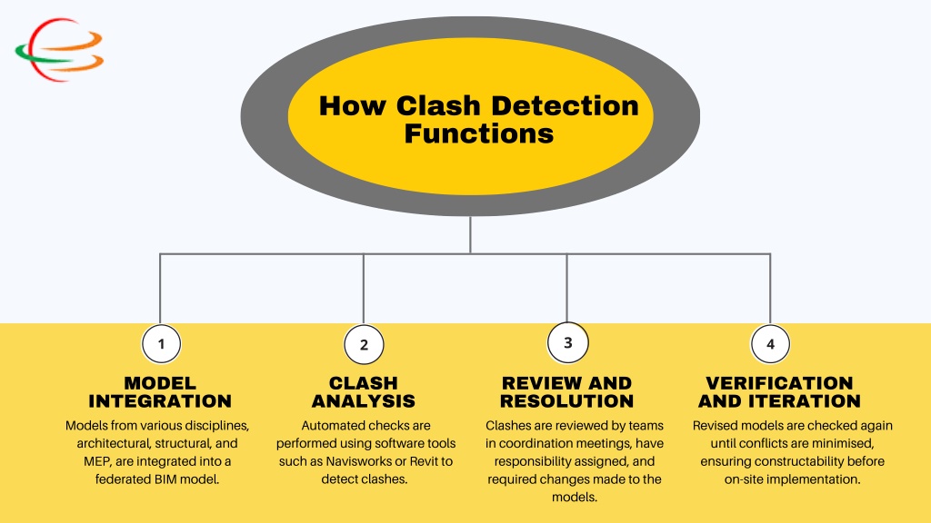 How Clash Detection Functions MODEL INTEGRATION Models from various disciplines, architectural, structural, and MEP, are integrated into a federated BIM model. CLASH ANALYSIS Automated checks are performed using software tools such as Navisworks or Revit to detect clashes. REVIEW AND RESOLUTION Clashes are reviewed by teams in coordination meetings, have responsibility assigned, and required changes made to the models. VERIFICATION AND ITERATION Revised models are checked again until conflicts are minimised, ensuring constructability before on-site implementation.