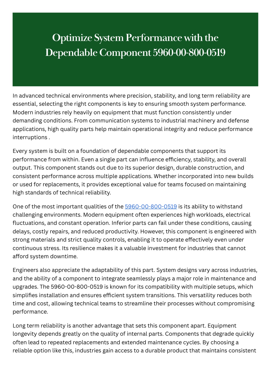 Optimize System Performance with the Dependable Component 5960-00-800-0519 In advanced technical environments where precision, stability, and long term reliability are essential, selecting the right components is key to ensuring smooth system performance. Modern industries rely heavily on equipment that must function consistently under demanding conditions. From communication systems to industrial machinery and defense applications, high quality parts help maintain operational integrity and reduce performance interruptions . Every system is built on a foundation of dependable components that support its performance from within. Even a single part can influence efficiency, stability, and overall output. This component stands out due to its superior design, durable construction, and consistent performance across multiple applications. Whether incorporated into new builds or used for replacements, it provides exceptional value for teams focused on maintaining high standards of technical reliability. One of the most important qualities of the 5960-00-800-0519 is its ability to withstand challenging environments. Modern equipment often experiences high workloads, electrical fluctuations, and constant operation. Inferior parts can fail under these conditions, causing delays, costly repairs, and reduced productivity. However, this component is engineered with strong materials and strict quality controls, enabling it to operate effectively even under continuous stress. Its resilience makes it a valuable investment for industries that cannot afford system downtime. Engineers also appreciate the adaptability of this part. System designs vary across industries, and the ability of a component to integrate seamlessly plays a major role in maintenance and upgrades. The 5960-00-800-0519 is known for its compatibility with multiple setups, which simplifies installation and ensures efficient system transitions. This versatility reduces both time and cost, allowing technical teams to streamline their processes without compromising performance. Long term reliability is another advantage that sets this component apart. Equipment longevity depends greatly on the quality of internal parts. Components that degrade quickly often lead to repeated replacements and extended maintenance cycles. By choosing a reliable option like this, industries gain access to a durable product that maintains consistent