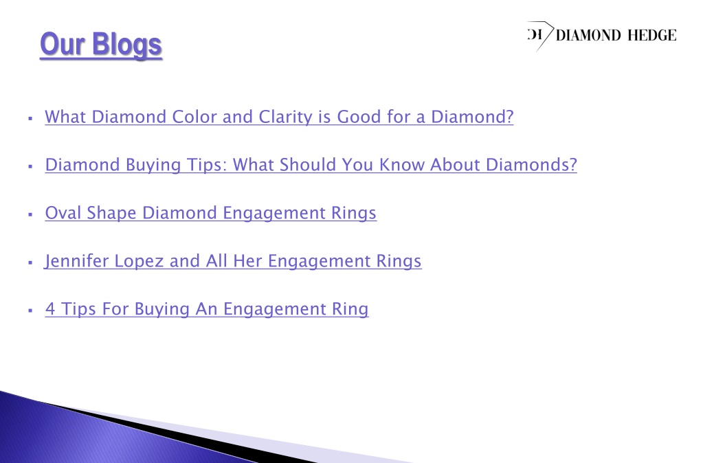 Our Blogs • What Diamond Color and Clarity is Good for a Diamond? • Diamond Buying Tips: What Should You Know About Diamonds? • Oval Shape Diamond Engagement Rings • Jennifer Lopez and All Her Engagement Rings • 4 Tips For Buying An Engagement Ring