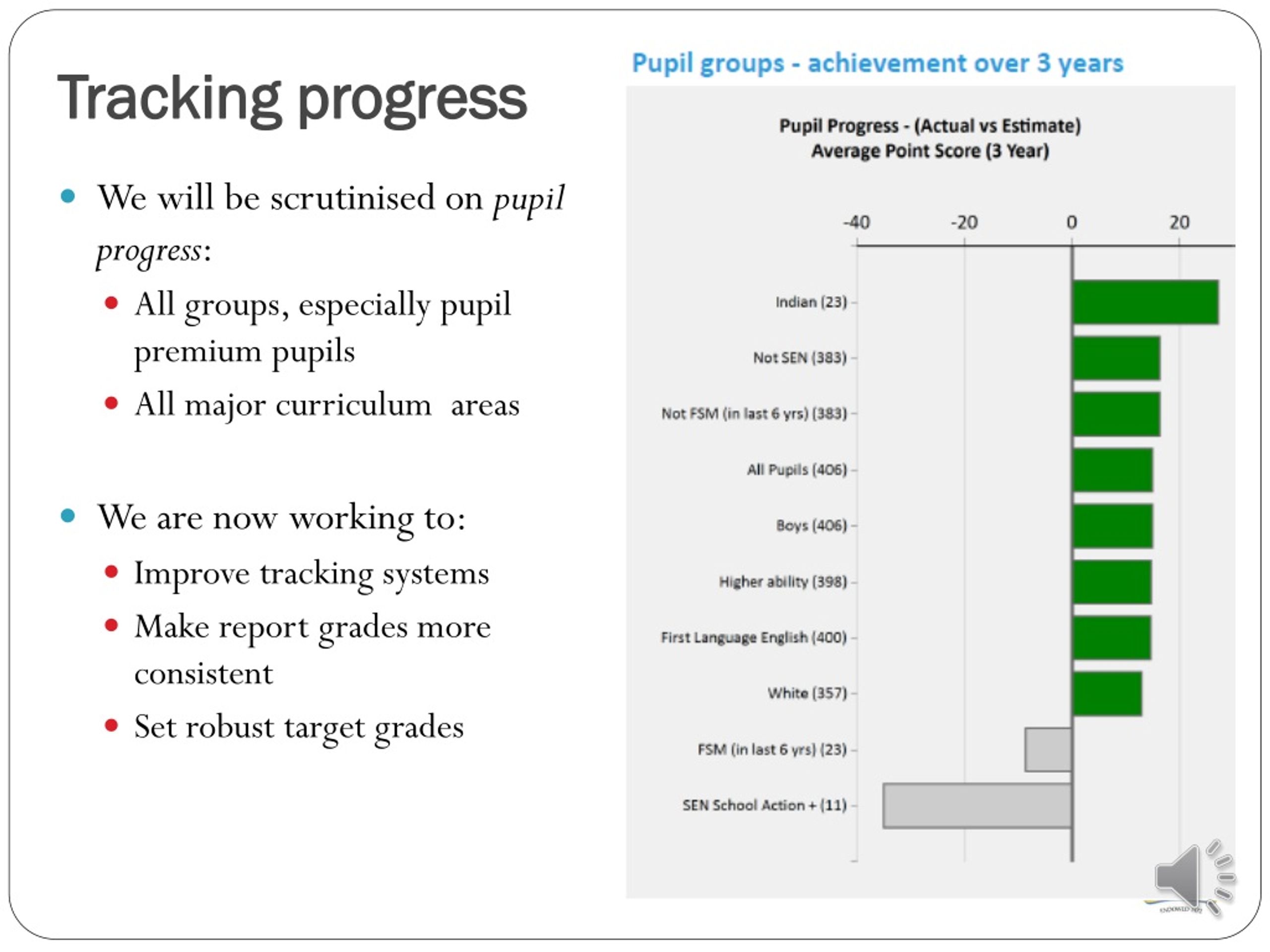 Tracking progress • We will be scrutinised on pupil progress: • All groups, especially pupil premium pupils • All major curriculum areas • We are now working to: • Improve tracking systems • Make report grades more consistent • Set robust target grades
