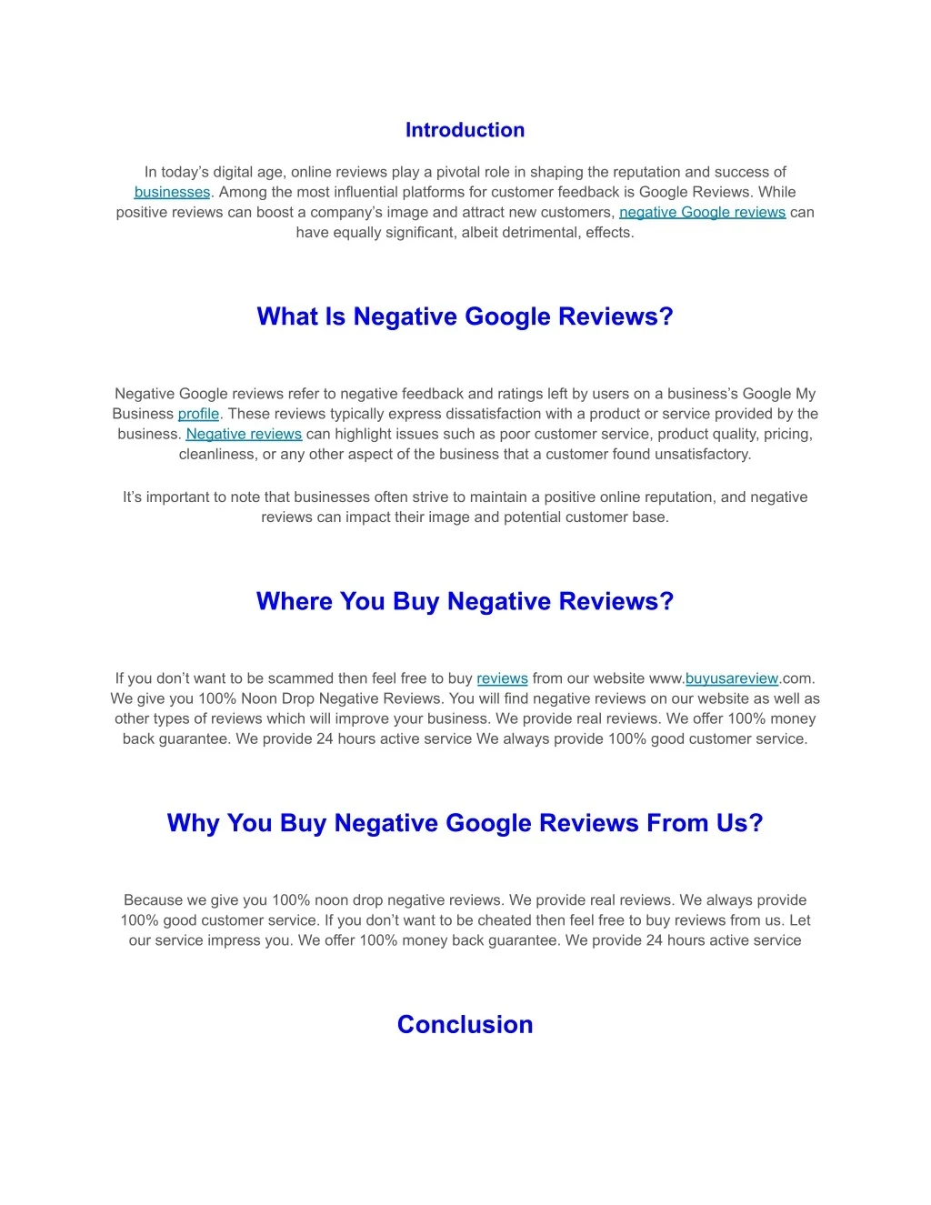 Introduction In today’s digital age, online reviews play a pivotal role in shaping the reputation and success of businesses. Among the most influential platforms for customer feedback is Google Reviews. While positive reviews can boost a company’s image and attract new customers, negative Google reviews can have equally significant, albeit detrimental, effects. What Is Negative Google Reviews? Negative Google reviews refer to negative feedback and ratings left by users on a business’s Google My Business profile. These reviews typically express dissatisfaction with a product or service provided by the business. Negative reviews can highlight issues such as poor customer service, product quality, pricing, cleanliness, or any other aspect of the business that a customer found unsatisfactory. It’s important to note that businesses often strive to maintain a positive online reputation, and negative reviews can impact their image and potential customer base. Where You Buy Negative Reviews? If you don’t want to be scammed then feel free to buy reviews from our website www.buyusareview.com. We give you 100% Noon Drop Negative Reviews. You will find negative reviews on our website as well as other types of reviews which will improve your business. We provide real reviews. We offer 100% money back guarantee. We provide 24 hours active service We always provide 100% good customer service. Why You Buy Negative Google Reviews From Us? Because we give you 100% noon drop negative reviews. We provide real reviews. We always provide 100% good customer service. If you don’t want to be cheated then feel free to buy reviews from us. Let our service impress you. We offer 100% money back guarantee. We provide 24 hours active service Conclusion
