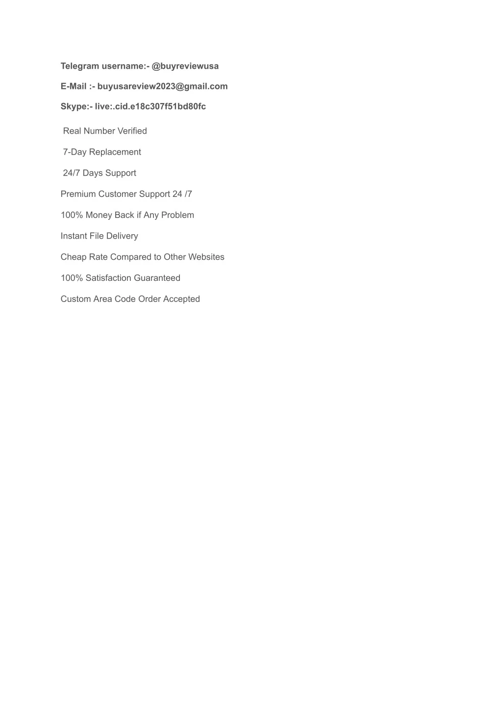Telegram username:- @buyreviewusa E-Mail :- buyusareview2023@gmail.com Skype:- live:.cid.e18c307f51bd80fc Real Number Verified 7-Day Replacement 24/7 Days Support Premium Customer Support 24 /7 100% Money Back if Any Problem Instant File Delivery Cheap Rate Compared to Other Websites 100% Satisfaction Guaranteed Custom Area Code Order Accepted