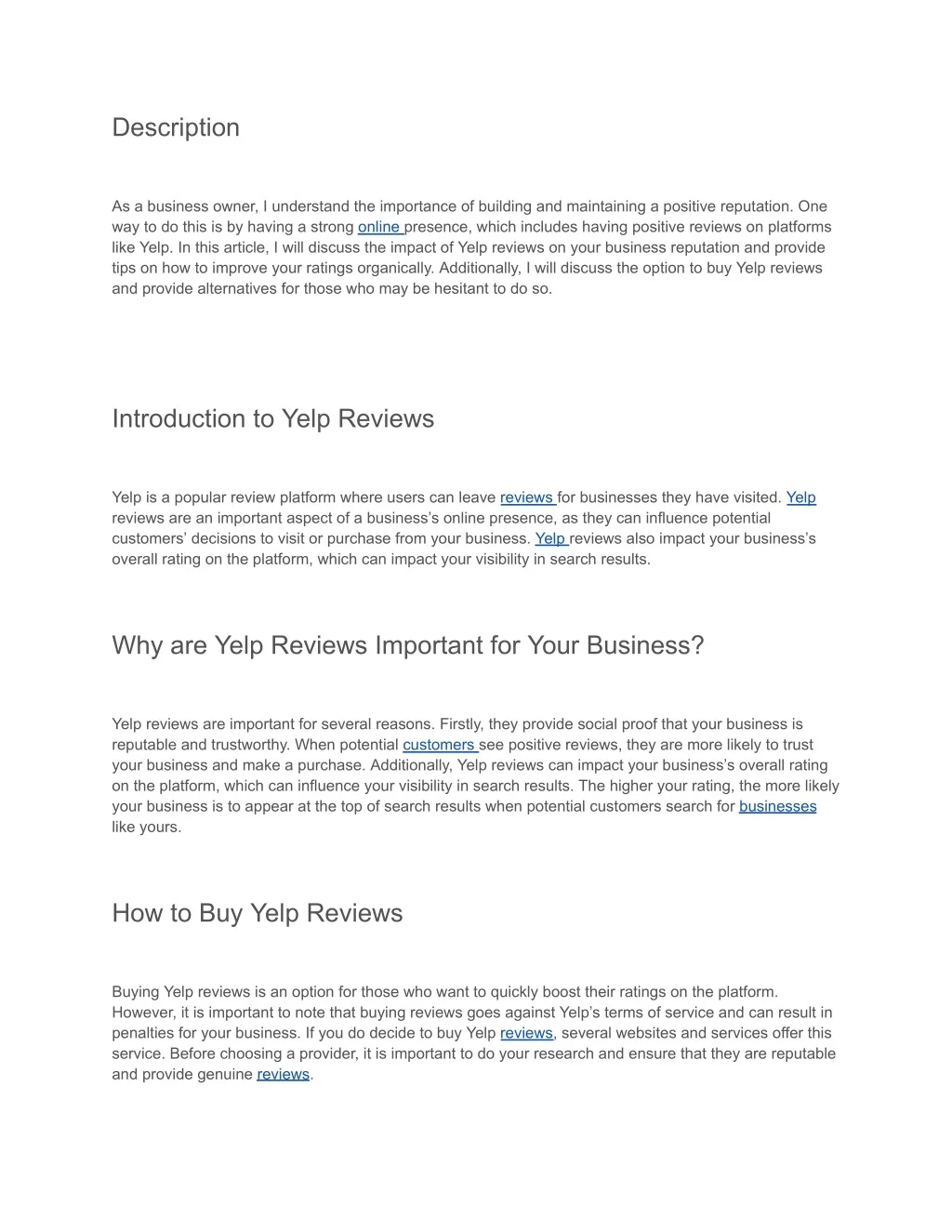 Description As a business owner, I understand the importance of building and maintaining a positive reputation. One way to do this is by having a strong online presence, which includes having positive reviews on platforms like Yelp. In this article, I will discuss the impact of Yelp reviews on your business reputation and provide tips on how to improve your ratings organically. Additionally, I will discuss the option to buy Yelp reviews and provide alternatives for those who may be hesitant to do so. Introduction to Yelp Reviews Yelp is a popular review platform where users can leave reviews for businesses they have visited. Yelp reviews are an important aspect of a business’s online presence, as they can influence potential customers’ decisions to visit or purchase from your business. Yelp reviews also impact your business’s overall rating on the platform, which can impact your visibility in search results. Why are Yelp Reviews Important for Your Business? Yelp reviews are important for several reasons. Firstly, they provide social proof that your business is reputable and trustworthy. When potential customers see positive reviews, they are more likely to trust your business and make a purchase. Additionally, Yelp reviews can impact your business’s overall rating on the platform, which can influence your visibility in search results. The higher your rating, the more likely your business is to appear at the top of search results when potential customers search for businesses like yours. How to Buy Yelp Reviews Buying Yelp reviews is an option for those who want to quickly boost their ratings on the platform. However, it is important to note that buying reviews goes against Yelp’s terms of service and can result in penalties for your business. If you do decide to buy Yelp reviews, several websites and services offer this service. Before choosing a provider, it is important to do your research and ensure that they are reputable and provide genuine reviews.