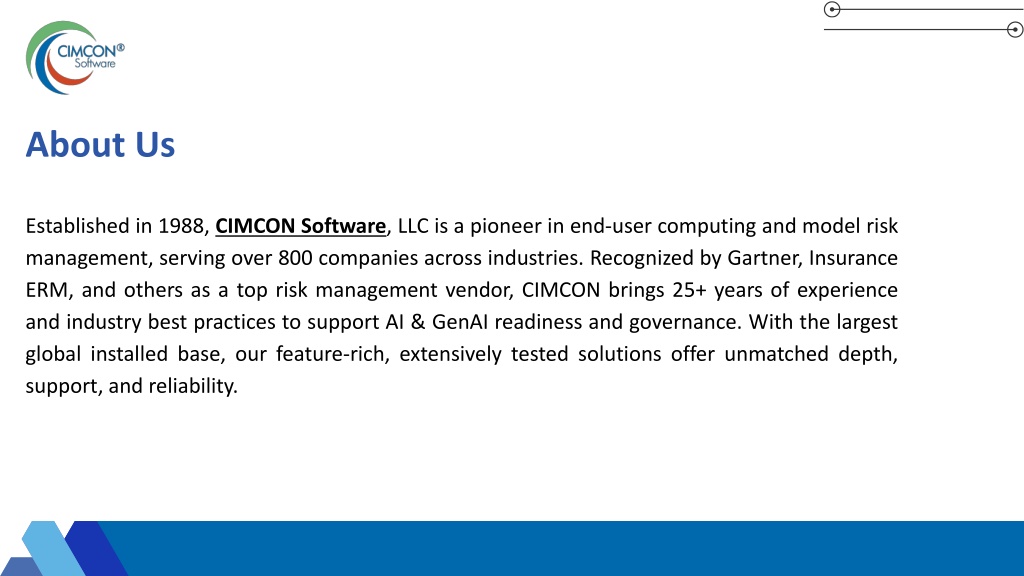 9. About Us Established in 1988, CIMCON Software, LLC is a pioneer in end-user computing and model risk management, serving over 800 companies across industries. Recognized by Gartner, Insurance ERM, and others as a top risk management vendor, CIMCON brings 25+ years of experience and industry best practices to support AI & GenAI readiness and governance. With the largest global installed base, our feature-rich, extensively tested solutions offer unmatched depth, support, and reliability.