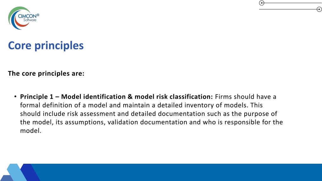 5. Core principles The core principles are: • Principle 1 – Model identification & model risk classification: Firms should have a formal definition of a model and maintain a detailed inventory of models. This should include risk assessment and detailed documentation such as the purpose of the model, its assumptions, validation documentation and who is responsible for the model.