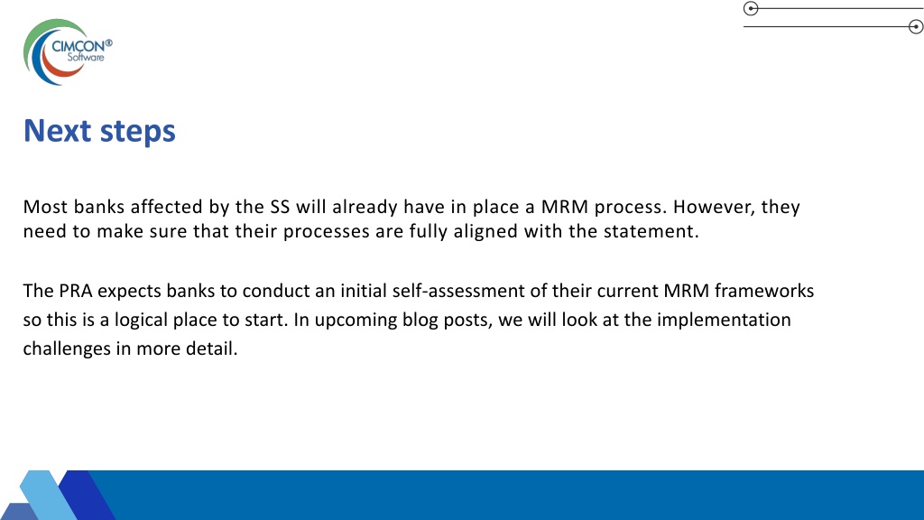 8. Next steps Most banks affected by the SS will already have in place a MRM process. However, they need to make sure that their processes are fully aligned with the statement. The PRA expects banks to conduct an initial self-assessment of their current MRM frameworks so this is a logical place to start. In upcoming blog posts, we will look at the implementation challenges in more detail.