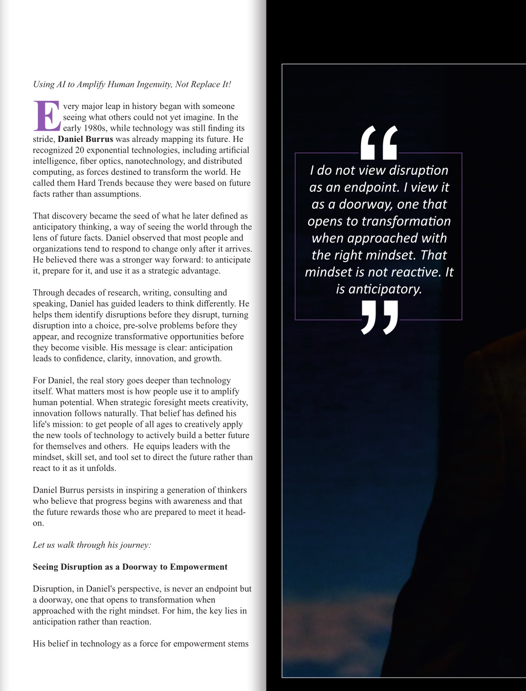 Using AI to Amplify Human Ingenuity, Not Replace It! E stride, Daniel Burrus was already mapping its future. He recognized 20 exponential technologies, including artificial intelligence, fiber optics, nanotechnology, and distributed computing, as forces destined to transform the world. He called them Hard Trends because they were based on future facts rather than assumptions. very major leap in history began with someone seeing what others could not yet imagine. In the early 1980s, while technology was still finding its That discovery became the seed of what he later defined as anticipatory thinking, a way of seeing the world through the lens of future facts. Daniel observed that most people and organizations tend to respond to change only after it arrives. He believed there was a stronger way forward: to anticipate it, prepare for it, and use it as a strategic advantage. Through decades of research, writing, consulting and speaking, Daniel has guided leaders to think differently. He helps them identify disruptions before they disrupt, turning disruption into a choice, pre-solve problems before they appear, and recognize transformative opportunities before they become visible. His message is clear: anticipation leads to confidence, clarity, innovation, and growth. For Daniel, the real story goes deeper than technology itself. What matters most is how people use it to amplify human potential. When strategic foresight meets creativity, innovation follows naturally. That belief has defined his life's mission: to get people of all ages to creatively apply the new tools of technology to actively build a better future for themselves and others. He equips leaders with the mindset, skill set, and tool set to direct the future rather than react to it as it unfolds. Daniel Burrus persists in inspiring a generation of thinkers who believe that progress begins with awareness and that the future rewards those who are prepared to meet it head- on. Let us walk through his journey: Seeing Disruption as a Doorway to Empowerment Disruption, in Daniel's perspective, is never an endpoint but a doorway, one that opens to transformation when approached with the right mindset. For him, the key lies in anticipation rather than reaction. His belief in technology as a force for empowerment stems