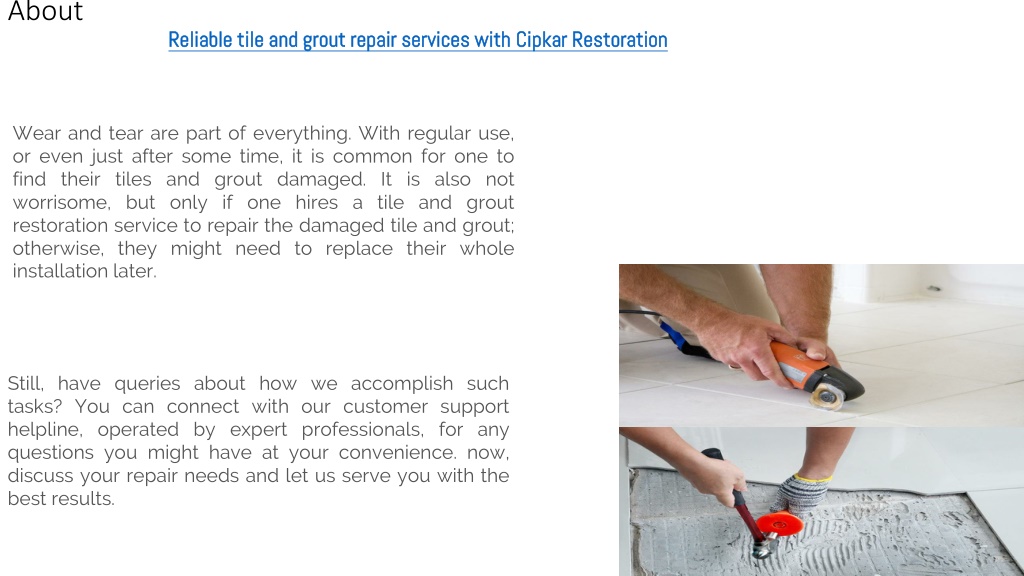 Reliable tile and grout repair services with Cipkar Restoration About Wear and tear are part of everything. With regular use, or even just after some time, it is common for one to find their tiles and grout damaged. It is also not worrisome, but only if one hires a tile and grout restoration service to repair the damaged tile and grout; otherwise, they might need to replace their whole installation later. Still, have queries about how we accomplish such tasks? You can connect with our customer support helpline, operated by expert professionals, for any questions you might have at your convenience. now, discuss your repair needs and let us serve you with the best results.