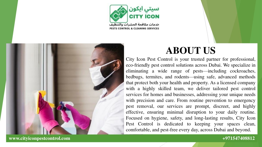 ABOUT US City Icon Pest Control is your trusted partner for professional, eco-friendly pest control solutions across Dubai. We specialize in eliminating a wide range of pests—including cockroaches, bedbugs, termites, and rodents—using safe, advanced methods that protect both your health and property. As a licensed company with a highly skilled team, we deliver tailored pest control services for homes and businesses, addressing your unique needs with precision and care. From routine prevention to emergency pest removal, our services are prompt, discreet, and highly effective, ensuring minimal disruption to your daily routine. Focused on hygiene, safety, and long-lasting results, City Icon Pest Control is dedicated to keeping your spaces clean, comfortable, and pest-free every day, across Dubai and beyond. www.cityiconpestcontrol.com +971547408812