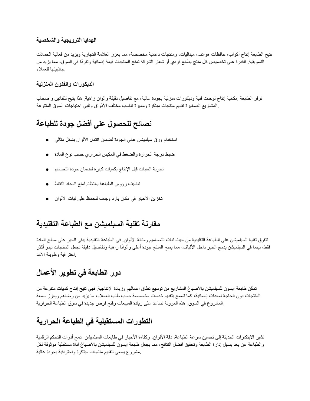 ﺔﯾﺻﺧﺷﻟاو ﺔﯾﺟﯾورﺗﻟا ﺎﯾادﮭﻟا ،ﺔﺻﺻﺧﻣ ﺎﻣﻣ ززﻌﯾ ﺔﻣﻼﻌﻟا ﺔﯾرﺎﺟﺗﻟا دﯾزﯾو نﻣ ﺔﯾﻟﺎﻌﻓ تﻼﻣﺣﻟا تﺎظﻓﺎﺣ صﯾﺻﺧﺗ لﻛ ﺞﺗﻧﻣ ﻊﺑﺎطﺑ يدرﻓ وأ رﺎﻌﺷ ﺔﻛرﺷﻟا ﺢﻧﻣﺗ تﺎﺟﺗﻧﻣﻟا ﺔﻣﯾﻗ ﺔﯾﻓﺎﺿإ اًدرﻔﺗو ﻲﻓ ،قوﺳﻟا ﺎﻣﻣ دﯾزﯾ نﻣ ﺎﮭﺗﯾﺑذﺎﺟ ءﻼﻣﻌﻠﻟ . ﺔﯾﺋﺎﻋد تﺎﺟﺗﻧﻣو ،تﺎﯾﻟادﯾﻣ ،فﺗاوھ ،باوﻛأ جﺎﺗﻧإ ةردﻘﻟا ﻰﻠﻋ ﺔﻌﺑﺎطﻟا .ﺔﯾﻘﯾوﺳﺗﻟا ﺢﯾﺗﺗ ﺔﯾﻟزﻧﻣﻟا نوﻧﻔﻟاو تاروﻛﯾدﻟا .ﺔﯾھاز اذھ ﺢﯾﺗﯾ نﯾﻧﺎﻧﻔﻠﻟ بﺎﺣﺻأو تﺎﺣوﻟ ﺔﯾﻧﻓ ﻊﯾرﺎﺷﻣﻟا ةرﯾﻐﺻﻟا مﯾدﻘﺗ تﺎﺟﺗﻧﻣ ةرﻛﺗﺑﻣ ةزﯾﻣﻣو بﺳﺎﻧﺗ فﻠﺗﺧﻣ قاوذﻷا ﻲﺑﻠﺗو تﺎﺟﺎﯾﺗﺣا قوﺳﻟا ﺔﻋوﻧﺗﻣﻟا ناوﻟأو ﺔﻘﯾﻗد لﯾﺻﺎﻔﺗ ،ﺔﯾﻟﺎﻋ ﻊﻣ ةدوﺟﺑ ﺔﯾﻟزﻧﻣ تاروﻛﯾدو جﺎﺗﻧإ . ﺔﯾﻧﺎﻛﻣإ ﺔﻌﺑﺎطﻟا رﻓوﺗ لوﺻﺣﻠﻟ ﻰﻠﻋ لﺿﻓأ ةدوﺟ ﺔﻋﺎﺑطﻠﻟ ﺢﺋﺎﺻﻧ ● ﻲﻟﺎﺛﻣ ةدﺎﻣﻟا مﯾﻣﺻﺗﻟا طﺎﻘﻧﻟا ناوﻟﻷا لﻛﺷﺑ ناوﻟﻷا لﺎﻘﺗﻧا نﺎﻣﺿﻟ ةدوﺟﻟا ﻲﻟﺎﻋ نﺷﯾﻣﻠﺑﺳ قرو مادﺧﺗﺳا ● عوﻧ بﺳﺣ يرارﺣﻟا سﺑﻛﻣﻟا طﻐﺿﻟاو ﻲﻓ ةرارﺣﻟا ﺔﺟرد طﺑﺿ ● ةدوﺟ نﺎﻣﺿﻟ ةرﯾﺑﻛ تﺎﯾﻣﻛﺑ جﺎﺗﻧﻹا تﺎﻧﯾﻌﻟا لﺑﻗ ﺔﺑرﺟﺗ ● دادﺳﻧا ﻊﻧﻣﻟ مﺎظﺗﻧﺎﺑ ﺔﻋﺎﺑطﻟا سوؤر فﯾظﻧﺗ ● رﺎﺑﺣﻷا ﻲﻓ نﺎﻛﻣ درﺎﺑ فﺎﺟو ظﺎﻔﺣﻠﻟ ﻰﻠﻋ تﺎﺑﺛ نﯾزﺧﺗ ﺔﯾدﯾﻠﻘﺗﻟا ﺔﻋﺎﺑطﻟا نﺷﯾﻣﻠﺑﺳﻟا ﻊﻣ ﺔﯾﻧﻘﺗ ﺔﻧرﺎﻘﻣ نﺷﯾﻣﻠﺑﺳﻟا ﻰﻠﻋ ﺔﻋﺎﺑطﻟا ﺔﯾدﯾﻠﻘﺗﻟا نﻣ ثﯾﺣ تﺎﺑﺛ مﯾﻣﺎﺻﺗﻟا ﺔﻧﺎﺗﻣو .ناوﻟﻷا ﻲﻓ ﺔﻋﺎﺑطﻟا ﺔﯾدﯾﻠﻘﺗﻟا ﻰﻘﺑﯾ رﺑﺣﻟا ﻰﻠﻋ ﺢطﺳ ةدﺎﻣﻟا ﻰﻠﻋأ ﺎًﻧاوﻟأو ﺔﯾھاز لﯾﺻﺎﻔﺗو ﺔﻘﯾﻗد لﻌﺟﺗ تﺎﺟﺗﻧﻣﻟا ودﺑﺗ رﺛﻛأ ﺔﯾﻓارﺗﺣا ﺔﻠﯾوطو دﻣﻷا . قوﻔﺗﺗ ،طﻘﻓ ﺎﻣﻧﯾﺑ ﻲﻓ ﺔﯾﻧﻘﺗ نﺷﯾﻣﻠﺑﺳﻟا ﺞﻣدﯾ رﺑﺣﻟا لﺧاد ،فﺎﯾﻟﻷا ﺎﻣﻣ ﺢﻧﻣﯾ ﺞﺗﻧﻣﻟا ةدوﺟ لﺎﻣﻋﻷا رﯾوطﺗ ﺔﻌﺑﺎطﻟا ﻲﻓ رود ﻊﯾرﺎﺷﻣﻟا نﻣ ﻊﯾﺳوﺗ قﺎطﻧ مﮭﻟﺎﻣﻋأ ةدﺎﯾزو .ﺔﯾﺟﺎﺗﻧﻹا ﻲﮭﻓ ﺢﯾﺗﺗ جﺎﺗﻧإ تﺎﯾﻣﻛ ﺔﻋوﻧﺗﻣ نﻣ نّﻛﻣﺗ تﺎﺟﺗﻧﻣﻟا نود ﺔﺟﺎﺣﻟا تادﻌﻣﻟ ،ﺔﯾﻓﺎﺿإ ﺎﻣﻛ ﺢﻣﺳﺗ مﯾدﻘﺗﺑ تﺎﻣدﺧ ﺔﺻﺻﺧﻣ بﺳﺣ بﻠط ،ءﻼﻣﻌﻟا ﺎﻣ دﯾزﯾ نﻣ مھﺎﺿر ززﻌﯾو ﺔﻌﻣﺳ ﻰﻠﻋ ةدﺎﯾز تﺎﻌﯾﺑﻣﻟا ﺢﺗﻓو صرﻓ ةدﯾدﺟ ﻲﻓ قوﺳ ﺔﻋﺎﺑطﻟا ﺔﯾرارﺣﻟا غﺎﺑﺻﻷﺎﺑ نﺷﯾﻣﻠﺑﺳﻠﻟ نوﺳﺑإ ﺔﻌﺑﺎط دﻋﺎﺳﺗ ﺔﻧورﻣﻟا .قوﺳﻟا هذھ عورﺷﻣﻟا ﻲﻓ . ﺔﯾرارﺣﻟا ﺔﻋﺎﺑطﻟا ﺔﯾﻠﺑﻘﺗﺳﻣﻟا ﻲﻓ تاروطﺗﻟا تارﺎﻛﺗﺑﻻا نﻋ دﻌﺑ لﮭﺳﯾ ةرادإ ﺔﻌﺑﺎطﻟا قﯾﻘﺣﺗو لﺿﻓأ ،ﺞﺋﺎﺗﻧﻟا ﺎﻣﻣ لﻌﺟﯾ ﺔﻌﺑﺎط نوﺳﺑإ نﺷﯾﻣﻠﺑﺳﻠﻟ غﺎﺑﺻﻷﺎﺑ ةادأ ﺔﯾﻠﺑﻘﺗﺳﻣ ﺔﻗوﺛوﻣ لﻛﻟ عورﺷﻣ ﻰﻌﺳﯾ مﯾدﻘﺗﻟ تﺎﺟﺗﻧﻣ ةرﻛﺗﺑﻣ ﺔﯾﻓارﺗﺣاو ةدوﺟﺑ ﺔﯾﻟﺎﻋ . .نﺷﯾﻣﻠﺑﺳﻟا ﺞﻣد تاودأ مﻛﺣﺗﻟا ﺔﯾﻣﻗرﻟا تﺎﻌﺑﺎط رﺎﺑﺣﻷا ﻲﻓ ةءﺎﻔﻛو ،ناوﻟﻷا ،ﺔﻋﺎﺑطﻟا ﺔﻗد ﺔﻋرﺳ نﯾﺳﺣﺗ ﺔﺛﯾدﺣﻟا ﻰﻟإ رﯾﺷﺗ ﺔﻋﺎﺑطﻟاو