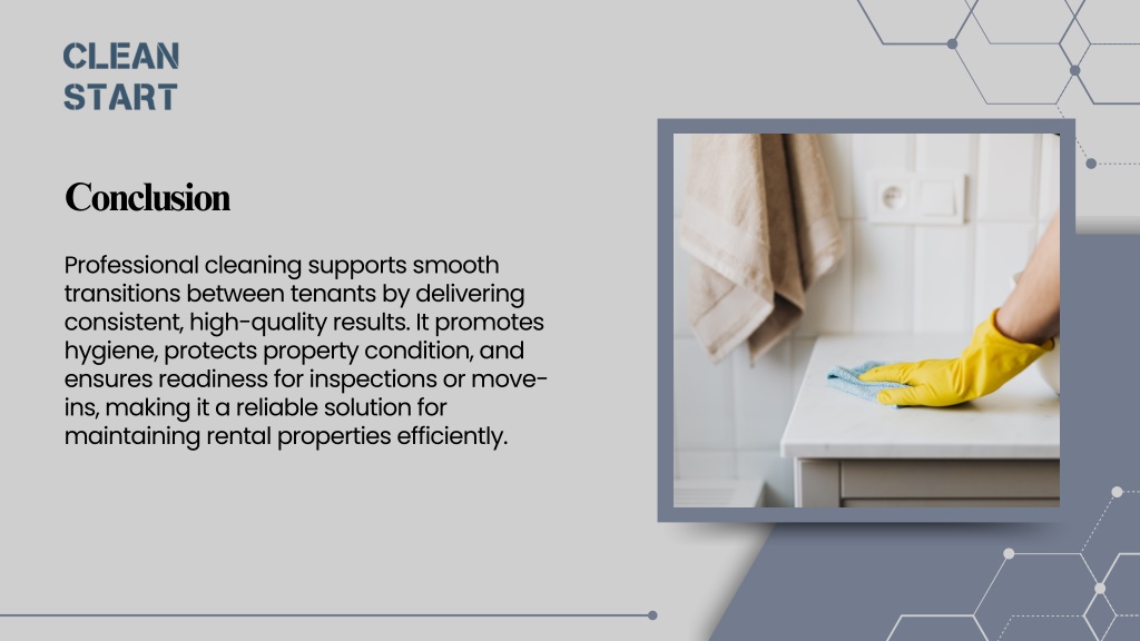 Conclusion Professional cleaning supports smooth transitions between tenants by delivering consistent, high-quality results. It promotes hygiene, protects property condition, and ensures readiness for inspections or move- ins, making it a reliable solution for maintaining rental properties efficiently.