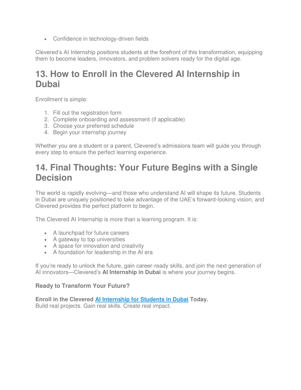 Confidence in technology-driven fields Clevered’s AI Internship positions students at the forefront of this transformation, equipping them to become leaders, innovators, and problem solvers ready for the digital age. 13. How to Enroll in the Clevered AI Internship in Dubai Enrollment is simple: 1. Fill out the registration form 2. Complete onboarding and assessment (if applicable) 3. Choose your preferred schedule 4. Begin your internship journey Whether you are a student or a parent, Clevered’s admissions team will guide you through every step to ensure the perfect learning experience. 14. Final Thoughts: Your Future Begins with a Single Decision The world is rapidly evolving—and those who understand AI will shape its future. Students in Dubai are uniquely positioned to take advantage of the UAE’s forward-looking vision, and Clevered provides the perfect platform to begin. The Clevered AI Internship is more than a learning program. It is: A launchpad for future careers A gateway to top universities A space for innovation and creativity A foundation for leadership in the AI era If you’re ready to unlock the future, gain career-ready skills, and join the next generation of AI innovators—Clevered’sAI Internship in Dubai is where your journey begins. Ready to Transform Your Future? Enroll in the Clevered AI Internship for Students in Dubai Today. Build real projects. Gain real skills. Create real impact.