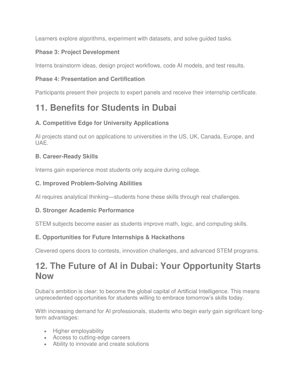 Learners explore algorithms, experiment with datasets, and solve guided tasks. Phase 3: Project Development Interns brainstorm ideas, design project workflows, code AI models, and test results. Phase 4: Presentation and Certification Participants present their projects to expert panels and receive their internship certificate. 11. Benefits for Students in Dubai A. Competitive Edge for University Applications AI projects stand out on applications to universities in the US, UK, Canada, Europe, and UAE. B. Career-Ready Skills Interns gain experience most students only acquire during college. C. Improved Problem-Solving Abilities AI requires analytical thinking—students hone these skills through real challenges. D. Stronger Academic Performance STEM subjects become easier as students improve math, logic, and computing skills. E. Opportunities for Future Internships & Hackathons Clevered opens doors to contests, innovation challenges, and advanced STEM programs. 12. The Future of AI in Dubai: Your Opportunity Starts Now Dubai’s ambition is clear: to become the global capital of Artificial Intelligence. This means unprecedented opportunities for students willing to embrace tomorrow’s skills today. With increasing demand for AI professionals, students who begin early gain significant long- term advantages: Higher employability Access to cutting-edge careers Ability to innovate and create solutions