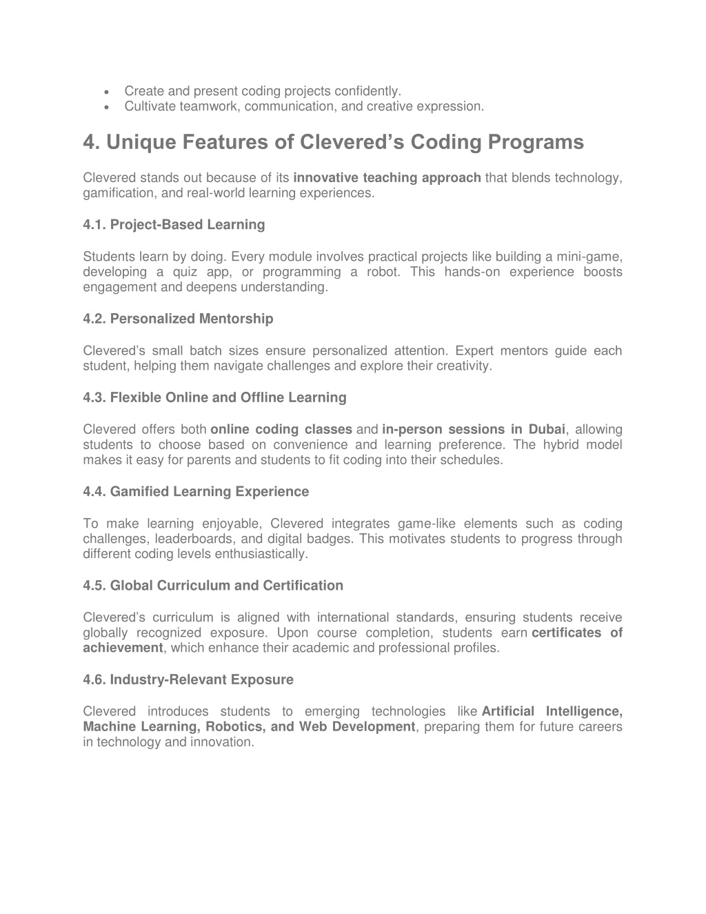 5. Coding Courses Offered by Clevered in Dubai Clevered provides a structured pathway that takes students from beginners to advanced levels in coding and technology. 5.1. Beginner Level (Ages 6–9) Course Highlights: Introduction to computers and logic Visual programming with Scratch Creating stories, animations, and simple games Understanding sequences, loops, and conditions Outcome: Students gain a fundamental understanding of how coding works and develop an early interest in technology. 5.2. Intermediate Level (Ages 10–13) Course Highlights: Introduction to Python and logical thinking Building interactive projects Basic robotics programming Introduction to HTML and CSS for web design Outcome: Students move beyond visual coding to text-based programming and start developing real- world projects. 5.3. Advanced Level (Ages 14–18) Course Highlights: Full-stack web development (HTML, CSS, JavaScript) Introduction to Artificial Intelligence and Machine Learning Robotics and IoT programming App and game development projects Outcome: Teenagers build functional apps, websites, and AI-driven projects, gaining exposure to professional-level tools and frameworks.