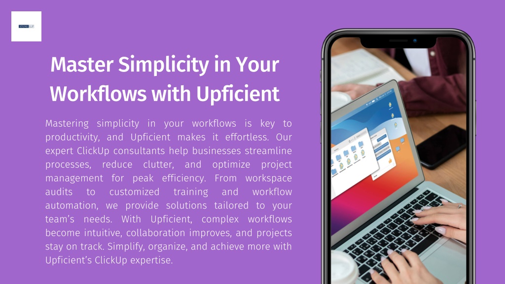 3. Master Simplicity in Your Workflows with Upficient Mastering simplicity in your workflows is key to productivity, and Upficient makes it effortless. Our expert ClickUp consultants help businesses streamline processes, reduce clutter, and optimize project management for peak efficiency. From workspace audits to customized automation, we provide solutions tailored to your team’s needs. With Upficient, complex workflows become intuitive, collaboration improves, and projects stay on track. Simplify, organize, and achieve more with Upficient’s ClickUp expertise. training and workflow