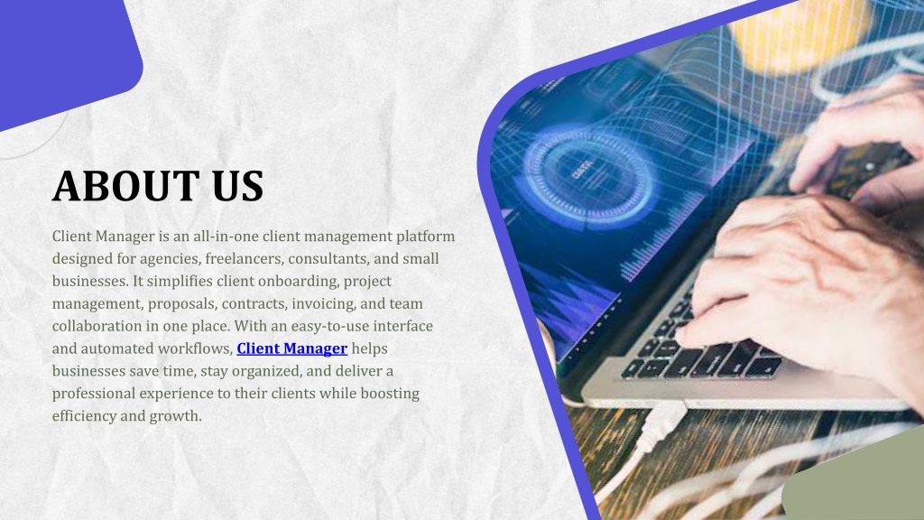 ABOUT US Client Manager is an all-in-one client management platform designed for agencies, freelancers, consultants, and small businesses. It simplifies client onboarding, project management, proposals, contracts, invoicing, and team collaboration in one place. With an easy-to-use interface and automated workflows, Client Manager helps businesses save time, stay organized, and deliver a professional experience to their clients while boosting efficiency and growth.