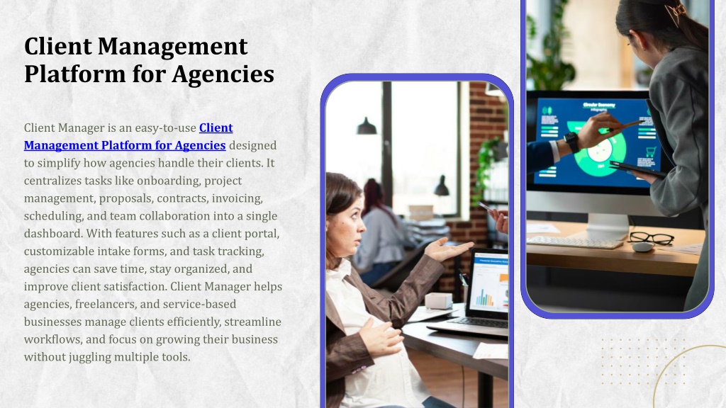 Client Management Platform for Agencies Client Manager is an easy-to-use Client Management Platform for Agencies designed to simplify how agencies handle their clients. It centralizes tasks like onboarding, project management, proposals, contracts, invoicing, scheduling, and team collaboration into a single dashboard. With features such as a client portal, customizable intake forms, and task tracking, agencies can save time, stay organized, and improve client satisfaction. Client Manager helps agencies, freelancers, and service-based businesses manage clients efficiently, streamline workflows, and focus on growing their business without juggling multiple tools.