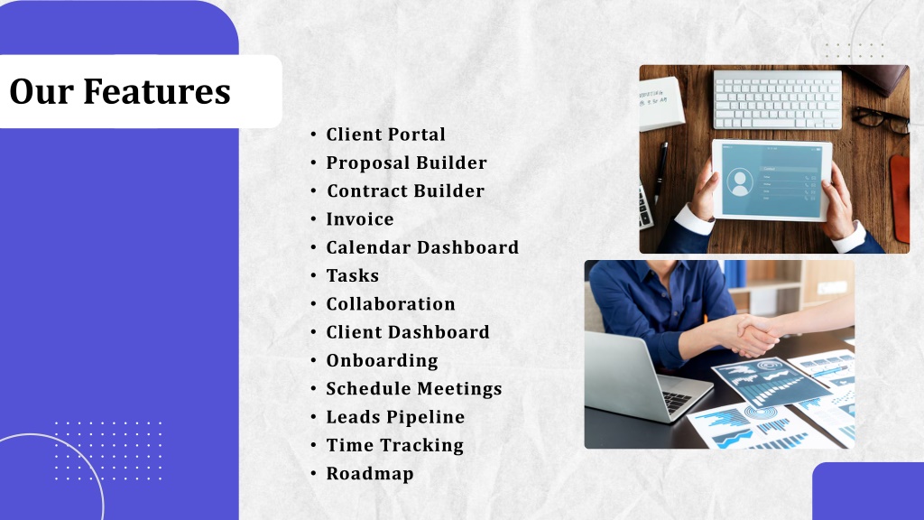 Our Features • Client Portal • Proposal Builder • Contract Builder • Invoice • Calendar Dashboard • Tasks • Collaboration • Client Dashboard • Onboarding • Schedule Meetings • Leads Pipeline • Time Tracking • Roadmap