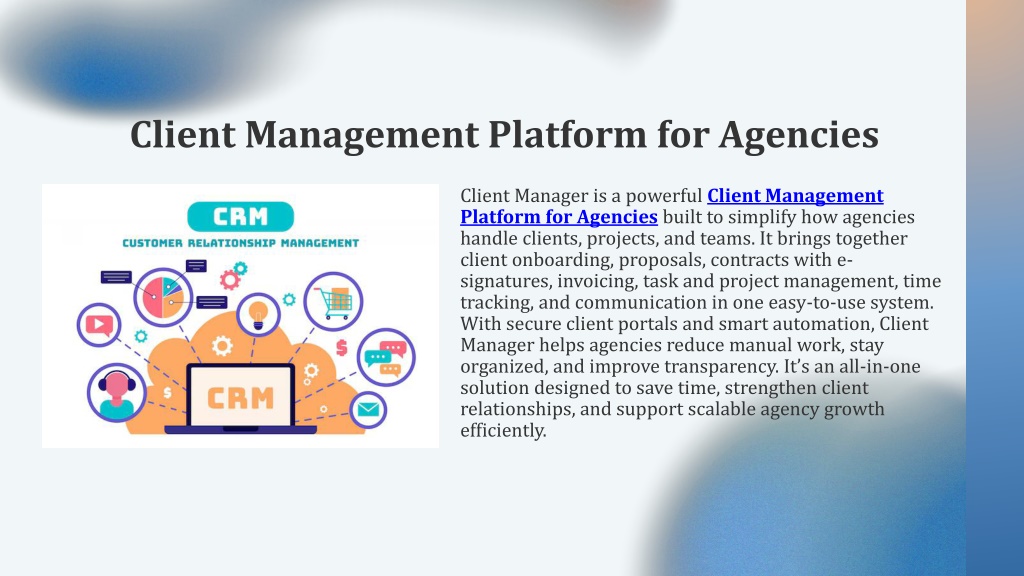 Client Management Platform for Agencies Client Manager is a powerful Client Management Platform for Agencies built to simplify how agencies handle clients, projects, and teams. It brings together client onboarding, proposals, contracts with e-signatures, invoicing, task and project management, time tracking, and communication in one easy-to-use system. With secure client portals and smart automation, Client Manager helps agencies reduce manual work, stay organized, and improve transparency. It’s an all-in-one solution designed to save time, strengthen client relationships, and support scalable agency growth efficiently.