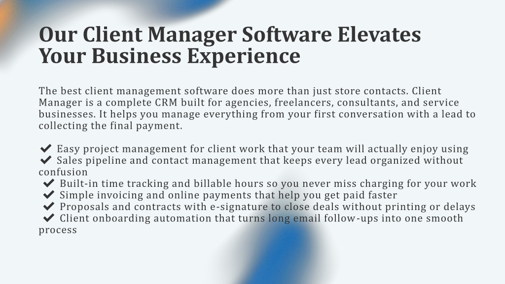 Our Client Manager Software Elevates Your Business Experience The best client management software does more than just store contacts. Client Manager is a complete CRM built for agencies, freelancers, consultants, and service businesses. It helps you manage everything from your first conversation with a lead to collecting the final payment. ✔ Easy project management for client work that your team will actually enjoy using ✔ Sales pipeline and contact management that keeps every lead organized without confusion ✔ Built-in time tracking and billable hours so you never miss charging for your work ✔ Simple invoicing and online payments that help you get paid faster ✔ Proposals and contracts with e-signature to close deals without printing or delays ✔ Client onboarding automation that turns long email follow-ups into one smooth process