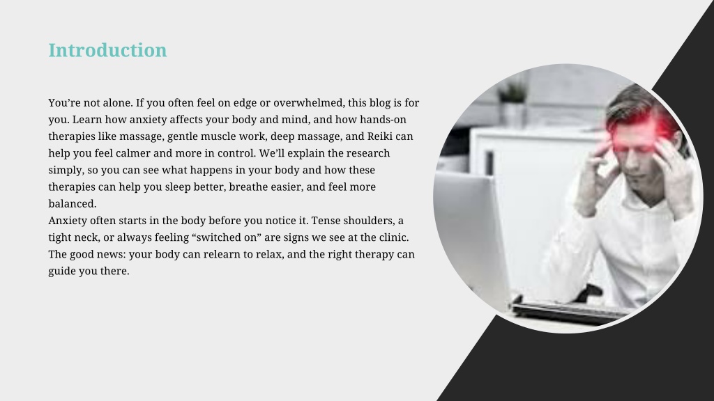 Introduction You’re not alone. If you often feel on edge or overwhelmed, this blog is for you. Learn how anxiety affects your body and mind, and how hands-on therapies like massage, gentle muscle work, deep massage, and Reiki can help you feel calmer and more in control. We’ll explain the research simply, so you can see what happens in your body and how these therapies can help you sleep better, breathe easier, and feel more balanced. Anxiety often starts in the body before you noticeit. Tense shoulders, a tight neck, or always feeling “switched on” are signs we see at the clinic. The good news: your body can relearn torelax,andthe right therapy can guide you there.