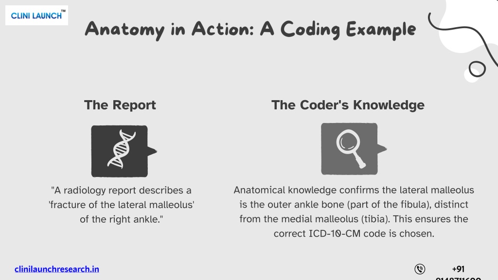 5. Anatomy in Action: A Coding Example • The Coder's Knowledge • The Report • Anatomical knowledge confirms the lateral malleolus is the outer ankle bone (part of the fibula), distinct from the medial malleolus (tibia). This ensures the correct ICD-10-CM code is chosen. • "A radiology report describes a 'fracture of the lateral malleolus' of the right ankle." clinilaunchresearch.in +91 9148711600