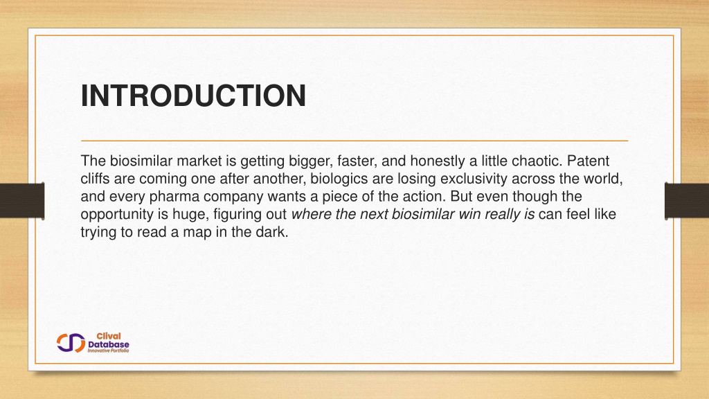2. INTRODUCTION The biosimilar market is getting bigger, faster, and honestly a little chaotic. Patent cliffs are coming one after another, biologics are losing exclusivity across the world, and every pharma company wants a piece of the action. But even though the opportunity is huge, figuring out where the next biosimilar win really is can feel like trying to read a map in the dark.