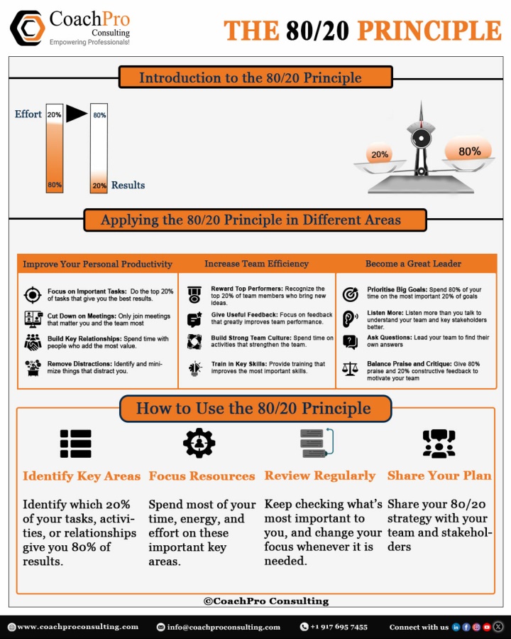 The Pareto 80/20 Principle is a concept that explains how results are often unevenly distributed. It states that around 80% of outcomes come from just 20% of causes. This means a small number of actions, tasks, or factors usually create most of the value or problems. The principle is widely used in business, project management, and daily life to improve focus and productivity. By identifying and concentrating on the most important activities, people and organizations can save time, reduce effort, and achieve better results.<br><br>*visit our website for more information (www.coachproconsulting.com)