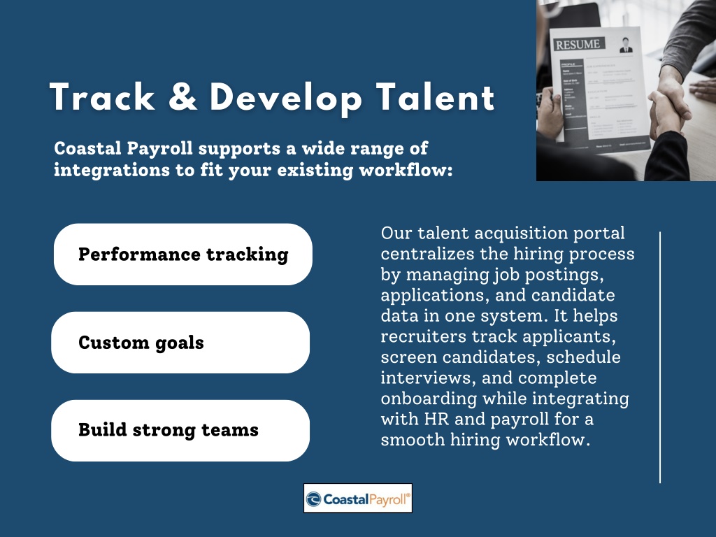 4. Track & Develop Talent Coastal Payroll supports a wide range of integrations to fit your existing workflow: Our talent acquisition portal centralizes the hiring process by managing job postings, applications, and candidate data in one system. It helps recruiters track applicants, screen candidates, schedule interviews, and complete onboarding while integrating with HR and payroll for a smooth hiring workflow. Performance tracking Custom goals Build strong teams